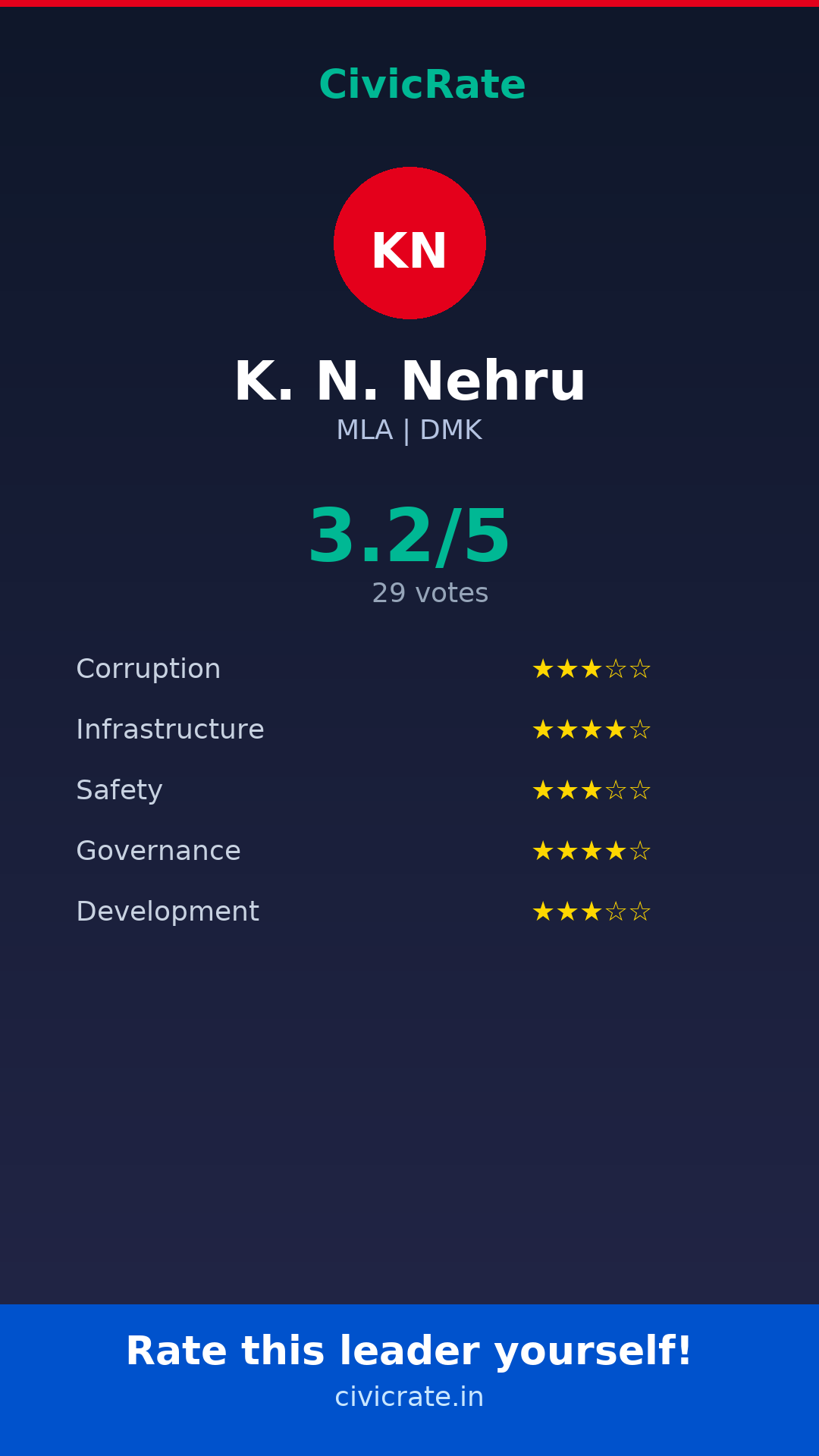 Visit civicrate.in/rate/k-n-nehru to rate K. N. Nehru on 5 parameters: Corruption, Infrastructure, Safety, Governance, and Development. All ratings are 100% anonymous and verified via phone OTP.