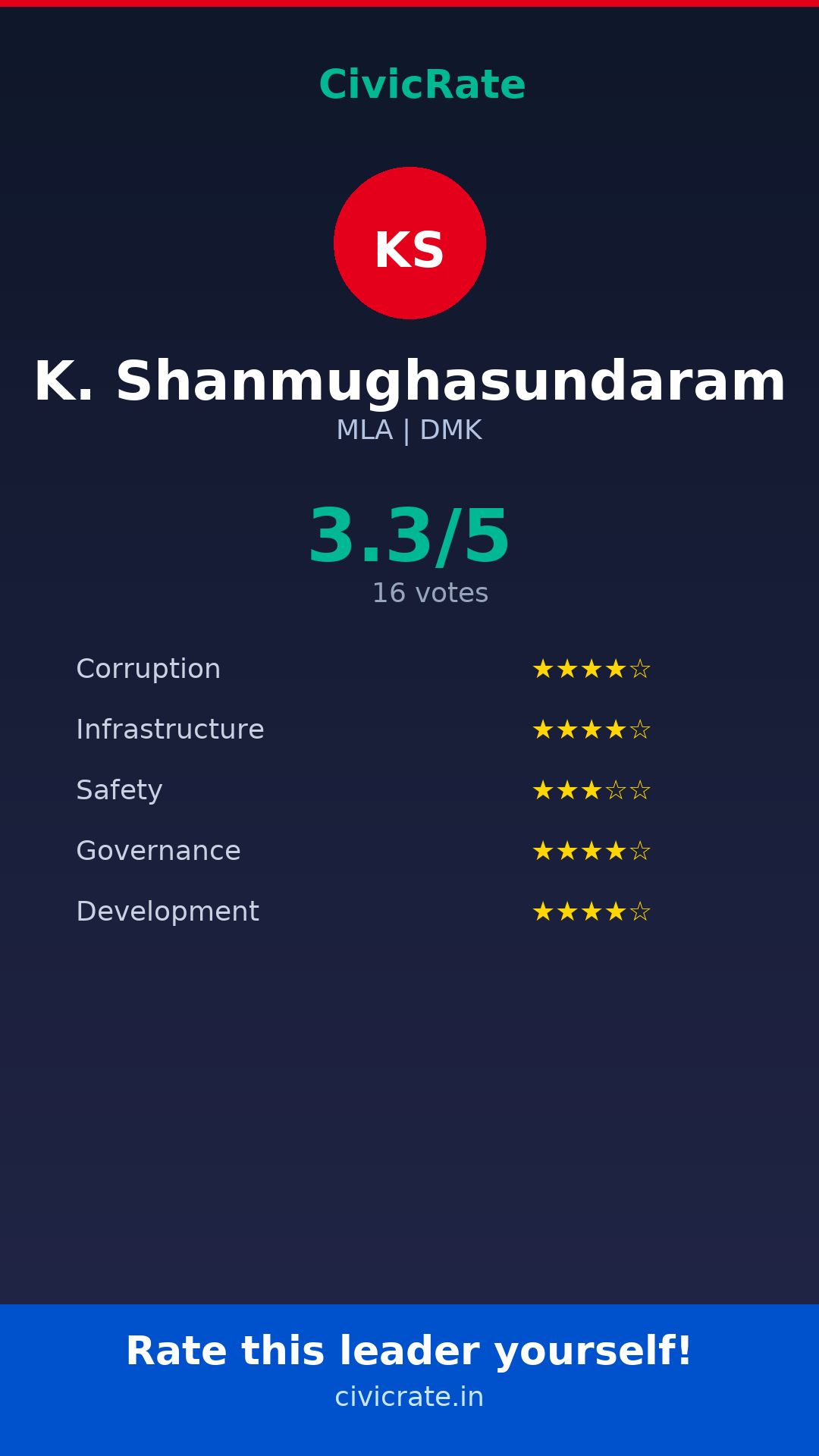 Visit civicrate.in/rate/k-shanmughasundaram to rate K. Shanmughasundaram on 5 parameters: Corruption, Infrastructure, Safety, Governance, and Development. All ratings are 100% anonymous and verified via phone OTP.