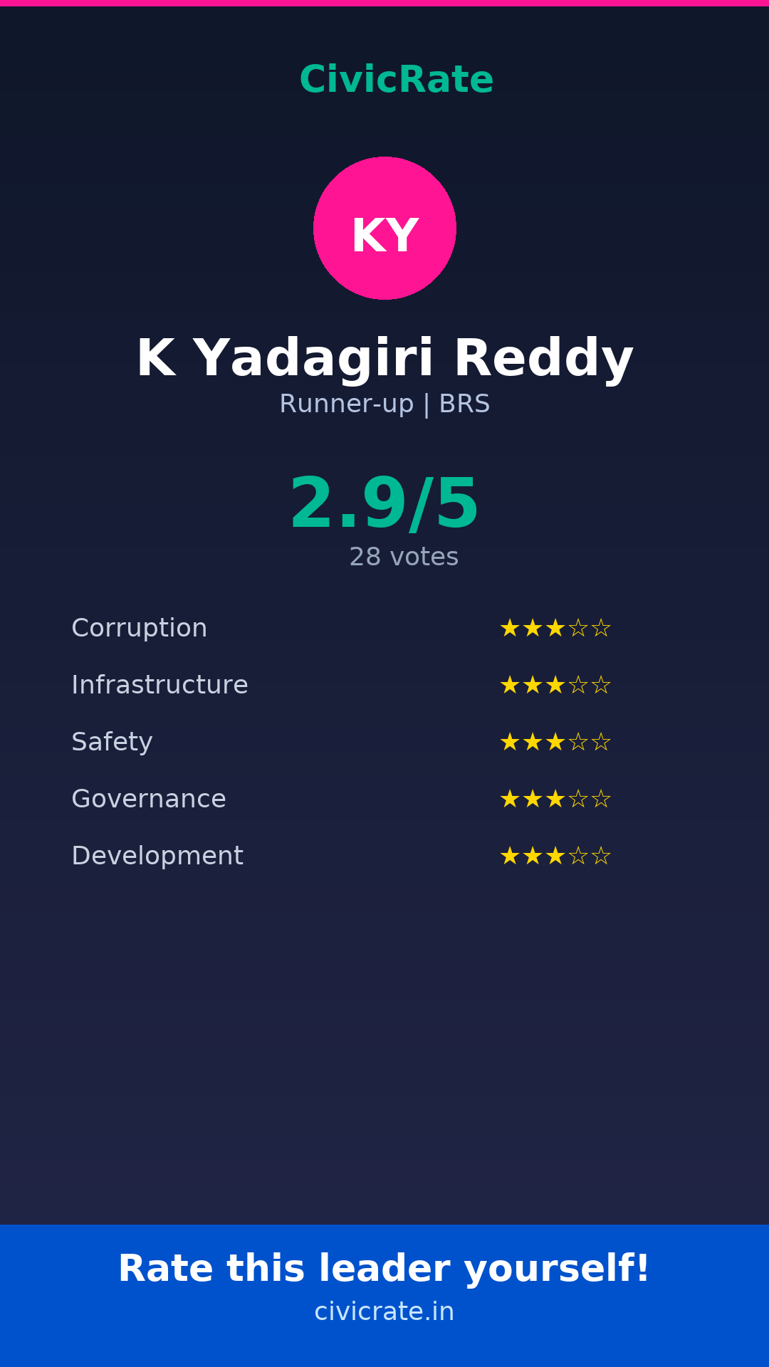 K Yadagiri Reddy (Runner-up, BRS) has an overall citizen rating (CR Score) of 2.9/5 based on 28 anonymous votes on CivicRate. The score covers 5 parameters: Corruption Perception, Infrastructure, Safety, Governance, and Development.
