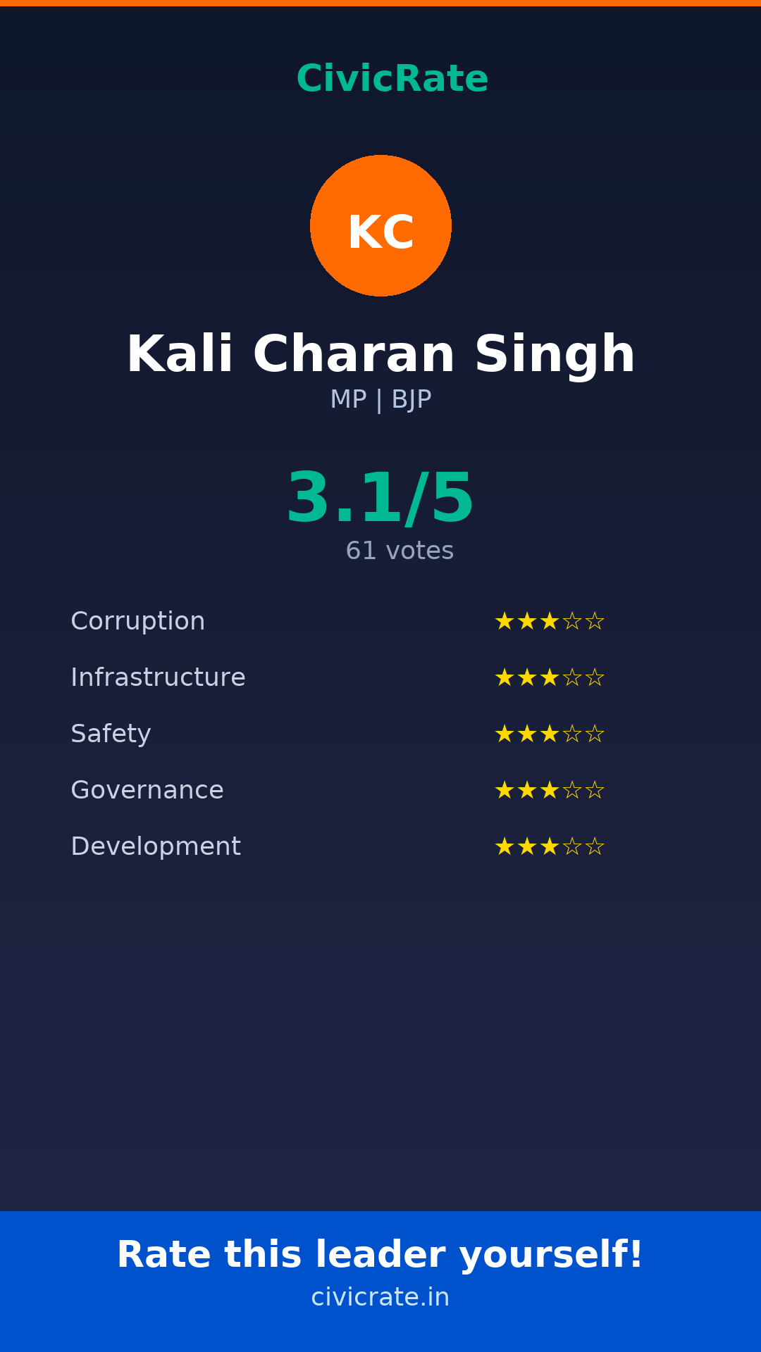 Kali Charan Singh (MP, BJP) has an overall citizen rating (CR Score) of 3.1/5 based on 61 anonymous votes on CivicRate. The score covers 5 parameters: Corruption Perception, Infrastructure, Safety, Governance, and Development.