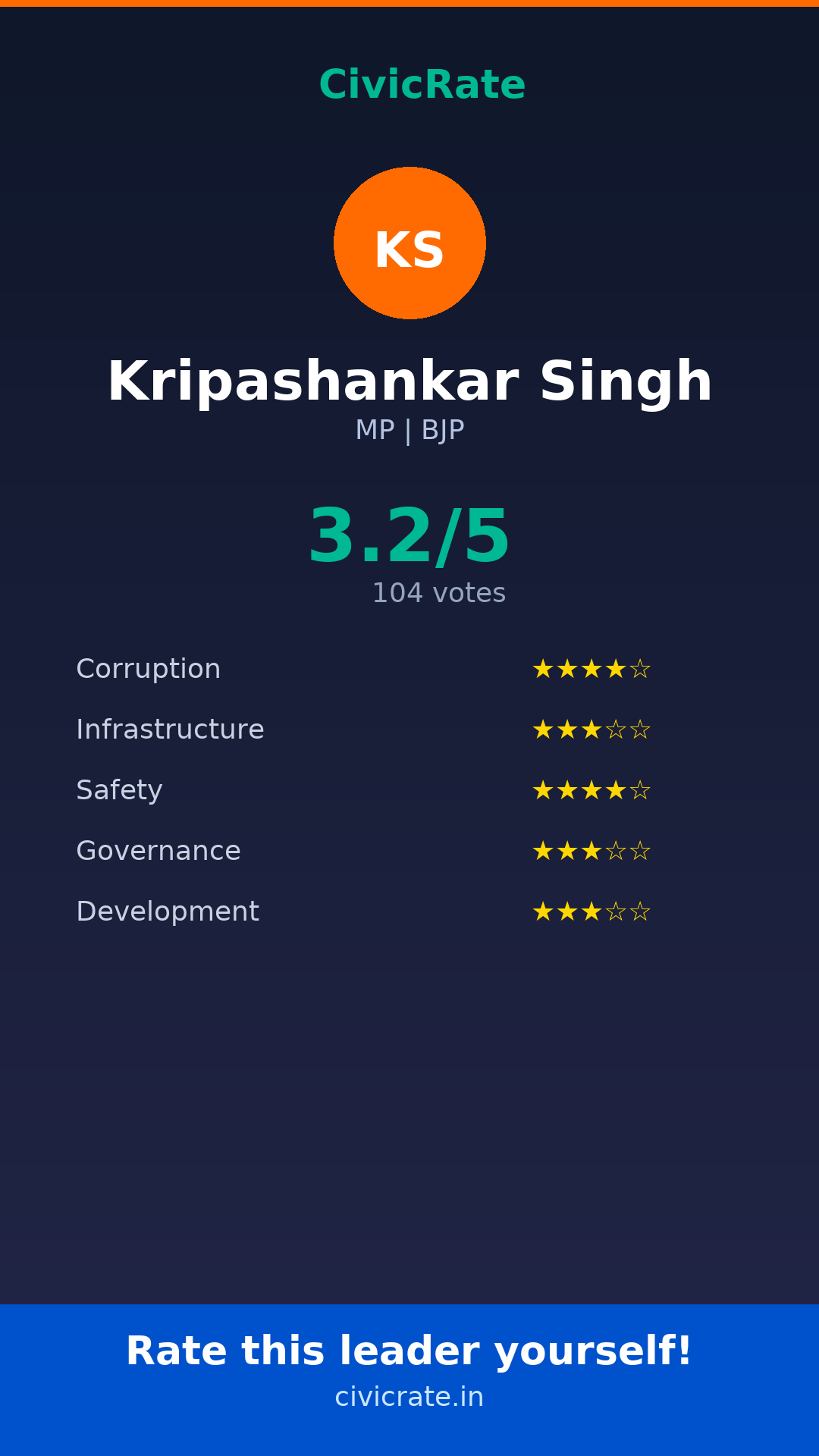 Kripashankar Singh (MP, BJP) has an overall citizen rating (CR Score) of 3.2/5 based on 104 anonymous votes on CivicRate. The score covers 5 parameters: Corruption Perception, Infrastructure, Safety, Governance, and Development.