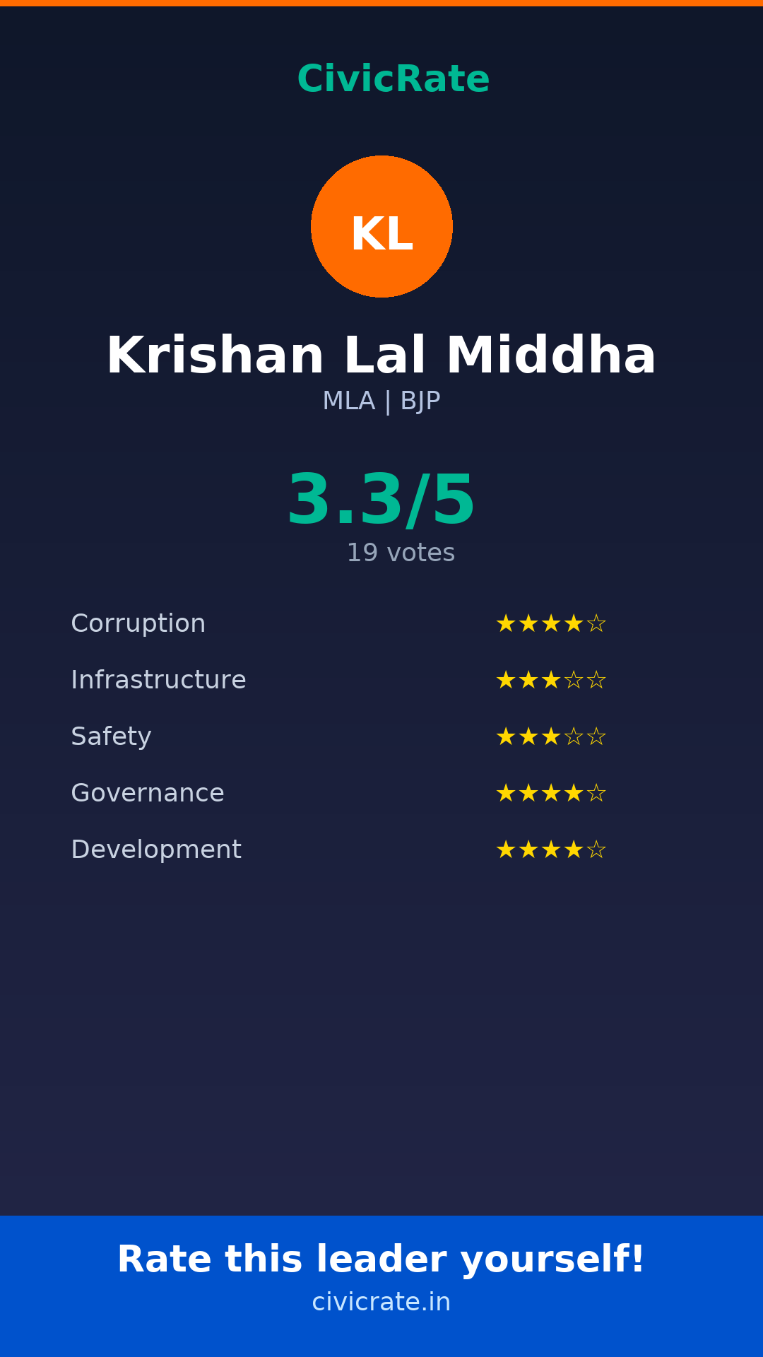 Krishan Lal Middha (MLA, BJP) has an overall citizen rating (CR Score) of 3.3/5 based on 19 anonymous votes on CivicRate. The score covers 5 parameters: Corruption Perception, Infrastructure, Safety, Governance, and Development.