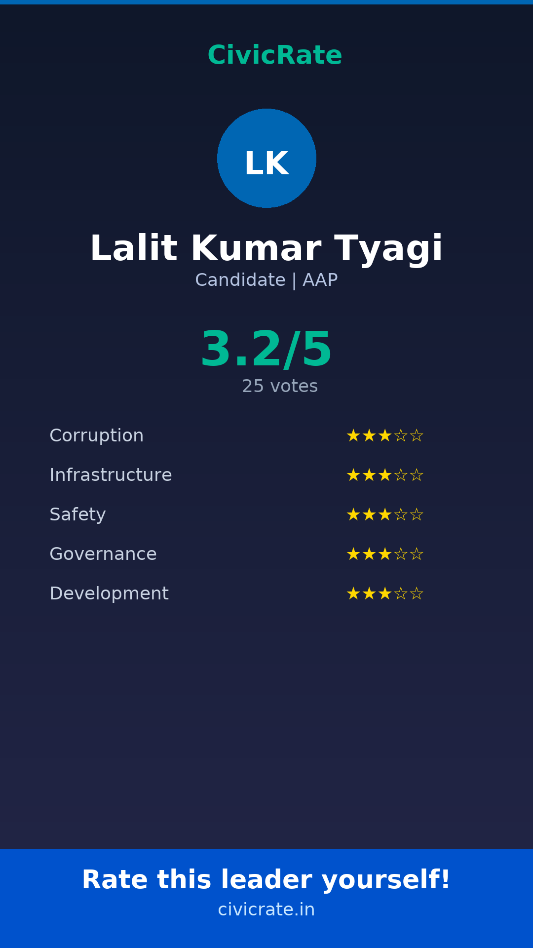 Lalit Kumar Tyagi (Candidate, AAP) has an overall citizen rating (CR Score) of 3.2/5 based on 25 anonymous votes on CivicRate. The score covers 5 parameters: Corruption Perception, Infrastructure, Safety, Governance, and Development.