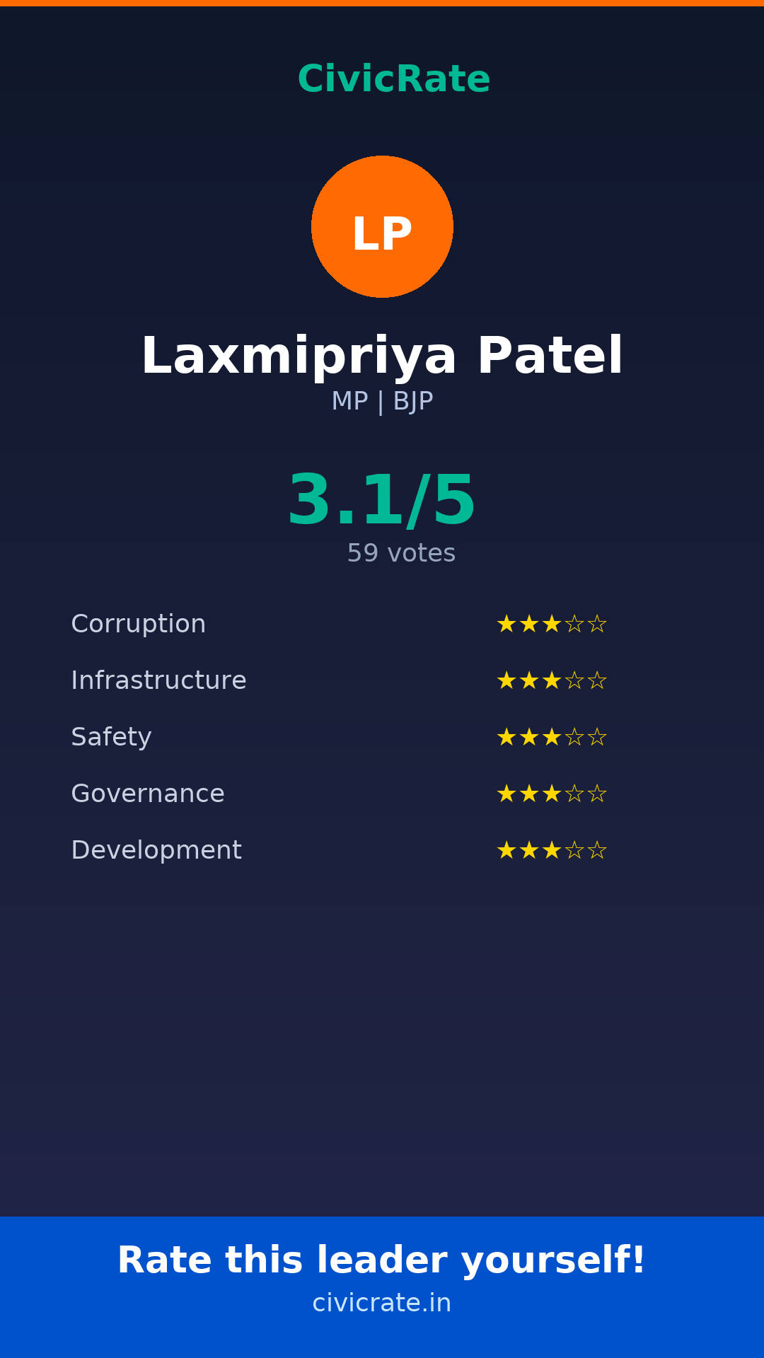 Laxmipriya Patel (MP, BJP) has an overall citizen rating (CR Score) of 3.1/5 based on 59 anonymous votes on CivicRate. The score covers 5 parameters: Corruption Perception, Infrastructure, Safety, Governance, and Development.