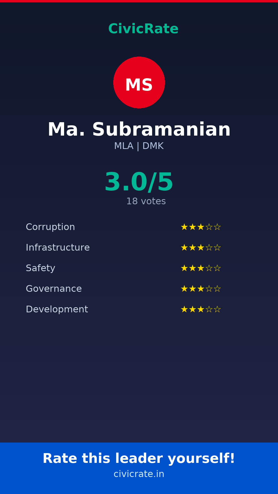 Ma. Subramanian (MLA, DMK) has an overall citizen rating (CR Score) of 3.0/5 based on 18 anonymous votes on CivicRate. The score covers 5 parameters: Corruption Perception, Infrastructure, Safety, Governance, and Development.