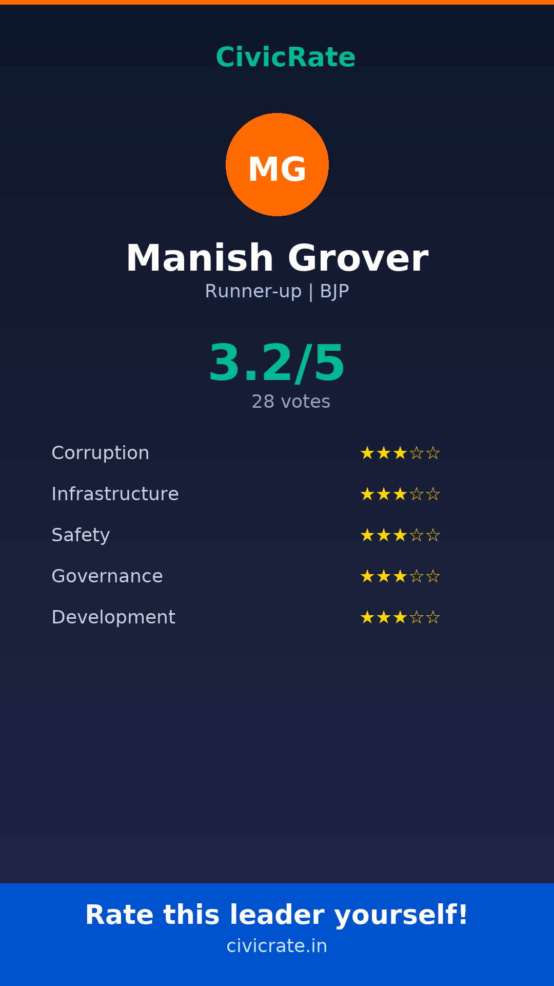 Manish Grover (Runner-up, BJP) has an overall citizen rating (CR Score) of 3.2/5 based on 28 anonymous votes on CivicRate. The score covers 5 parameters: Corruption Perception, Infrastructure, Safety, Governance, and Development.