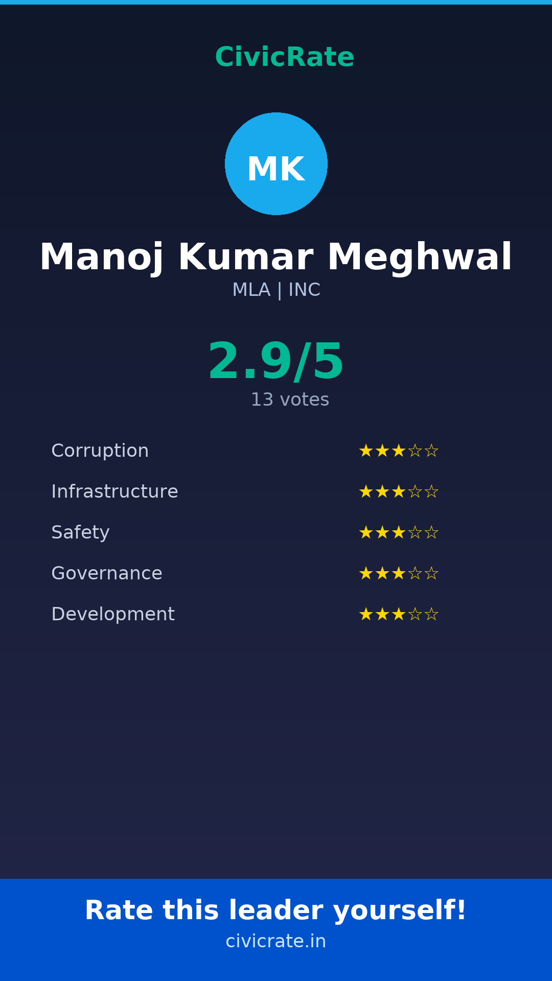 Manoj Kumar Meghwal (MLA, INC) has an overall citizen rating (CR Score) of 2.9/5 based on 13 anonymous votes on CivicRate. The score covers 5 parameters: Corruption Perception, Infrastructure, Safety, Governance, and Development.