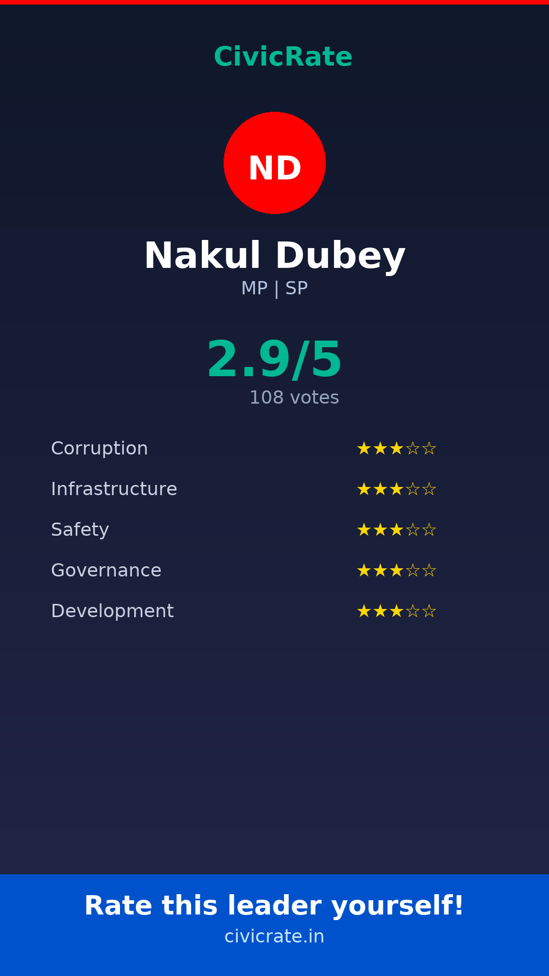 Nakul Dubey (MP, SP) has an overall citizen rating (CR Score) of 2.9/5 based on 108 anonymous votes on CivicRate. The score covers 5 parameters: Corruption Perception, Infrastructure, Safety, Governance, and Development.