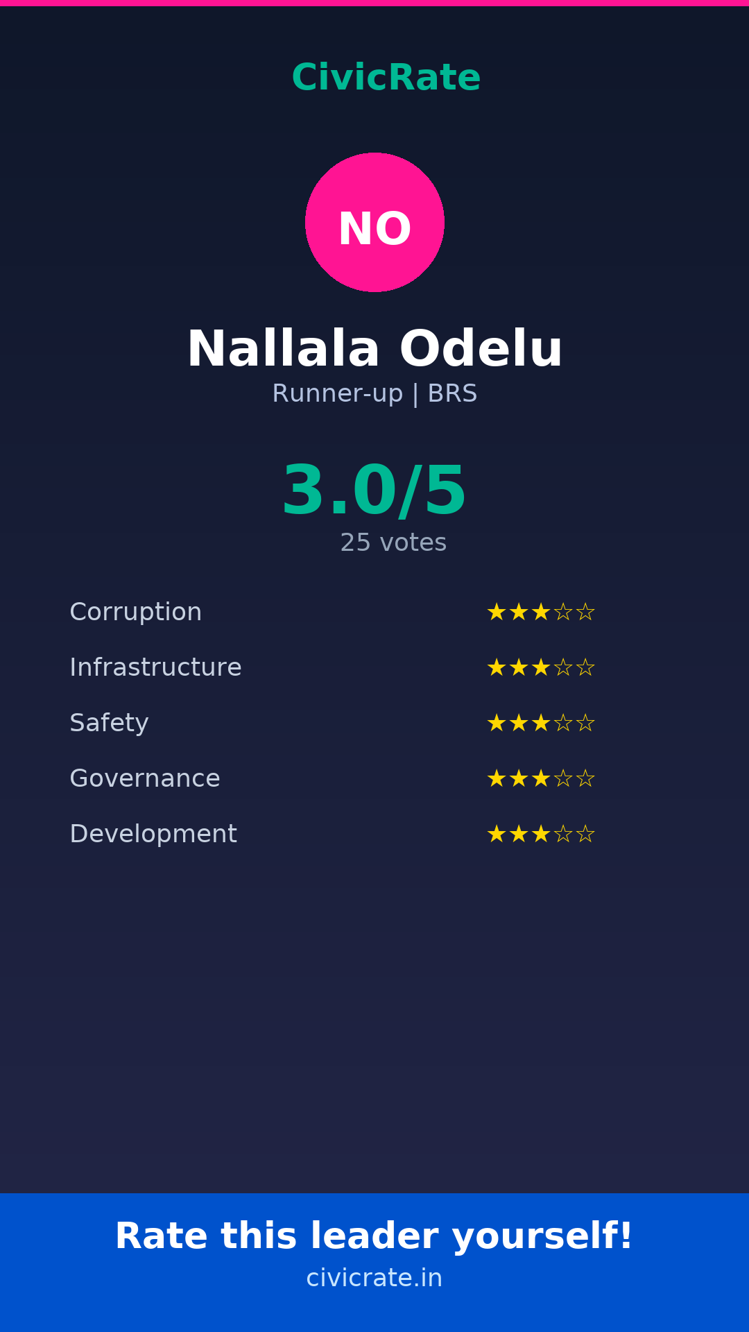 Nallala Odelu (Runner-up, BRS) has an overall citizen rating (CR Score) of 3.0/5 based on 25 anonymous votes on CivicRate. The score covers 5 parameters: Corruption Perception, Infrastructure, Safety, Governance, and Development.