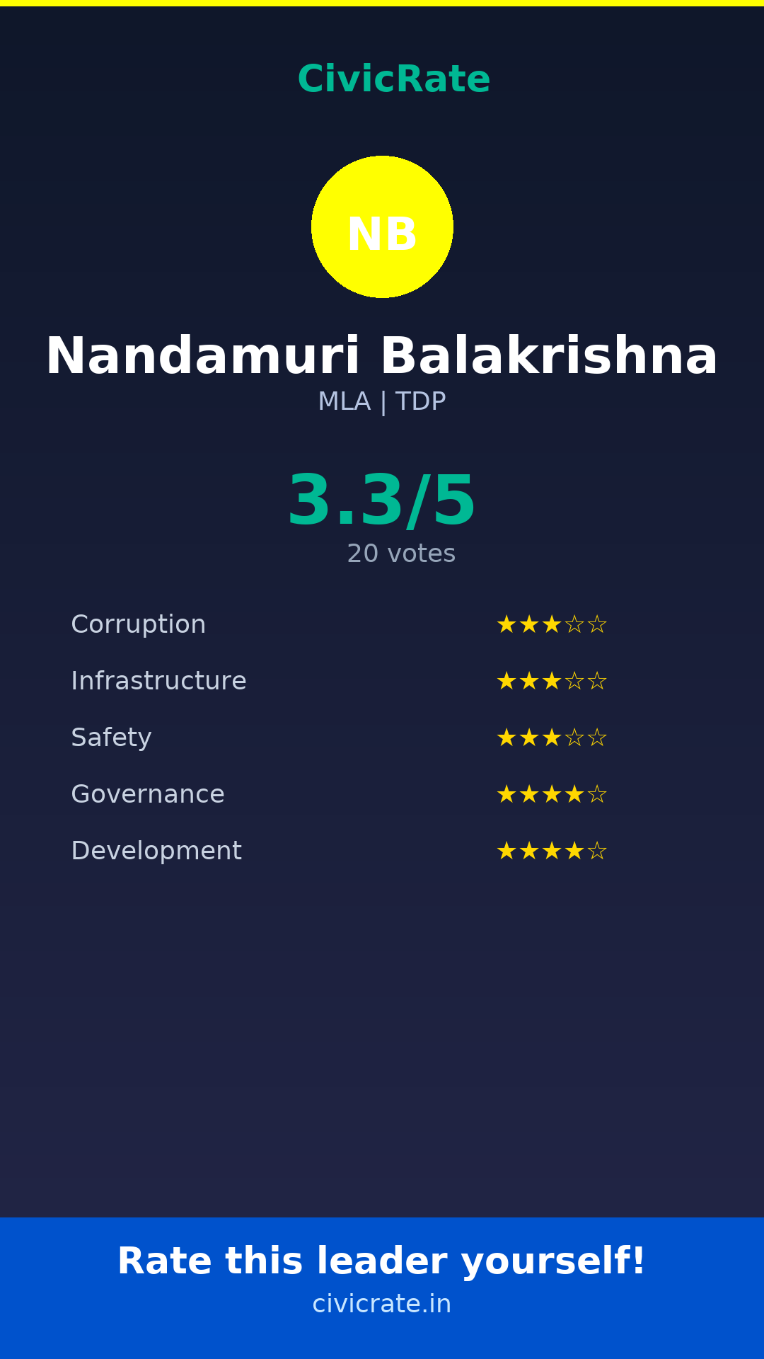 Visit civicrate.in/rate/nandamuri-balakrishna to rate Nandamuri Balakrishna on 5 parameters: Corruption, Infrastructure, Safety, Governance, and Development. All ratings are 100% anonymous and verified via phone OTP.
