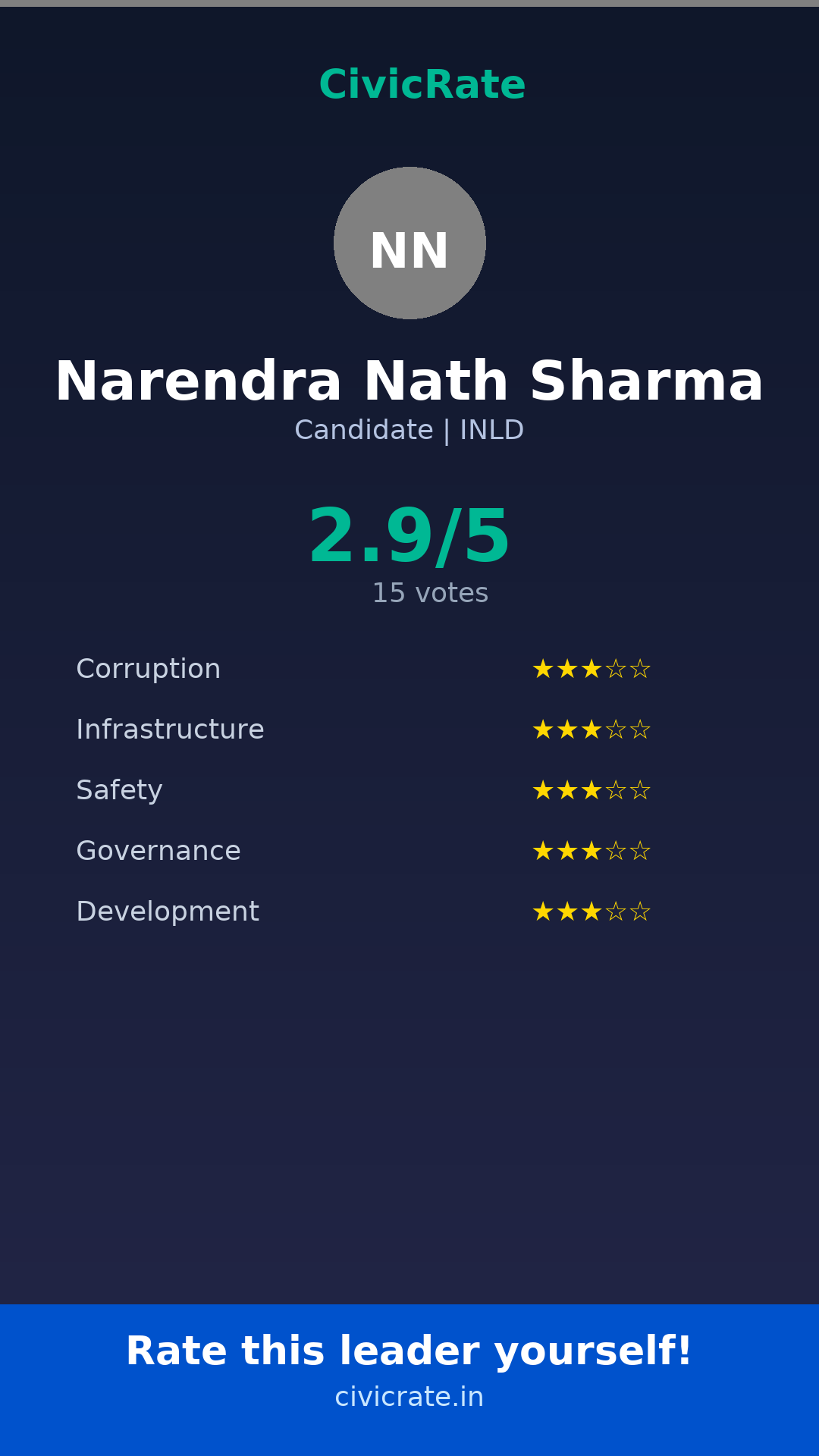 Narendra Nath Sharma (Candidate, INLD) has an overall citizen rating (CR Score) of 2.9/5 based on 15 anonymous votes on CivicRate. The score covers 5 parameters: Corruption Perception, Infrastructure, Safety, Governance, and Development.
