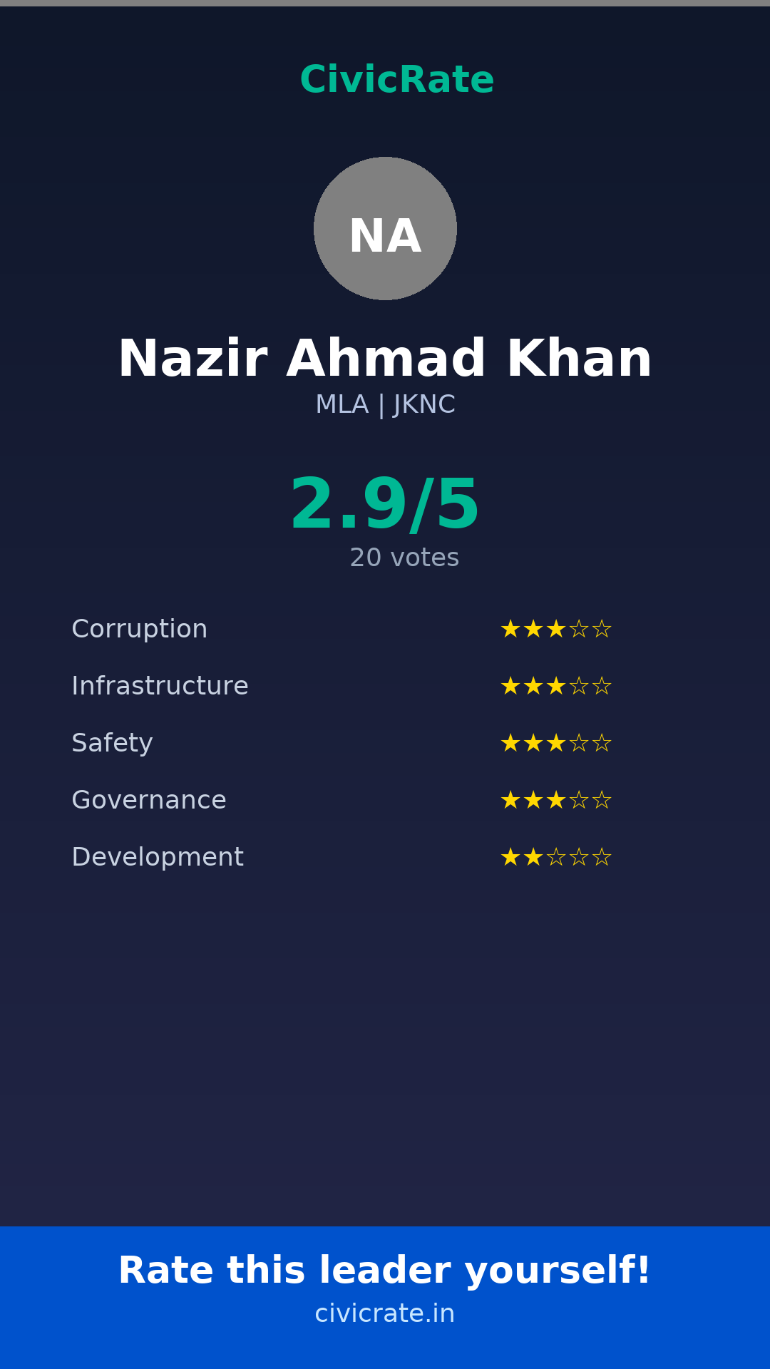 Nazir Ahmad Khan (MLA, JKNC) has an overall citizen rating (CR Score) of 2.9/5 based on 20 anonymous votes on CivicRate. The score covers 5 parameters: Corruption Perception, Infrastructure, Safety, Governance, and Development.