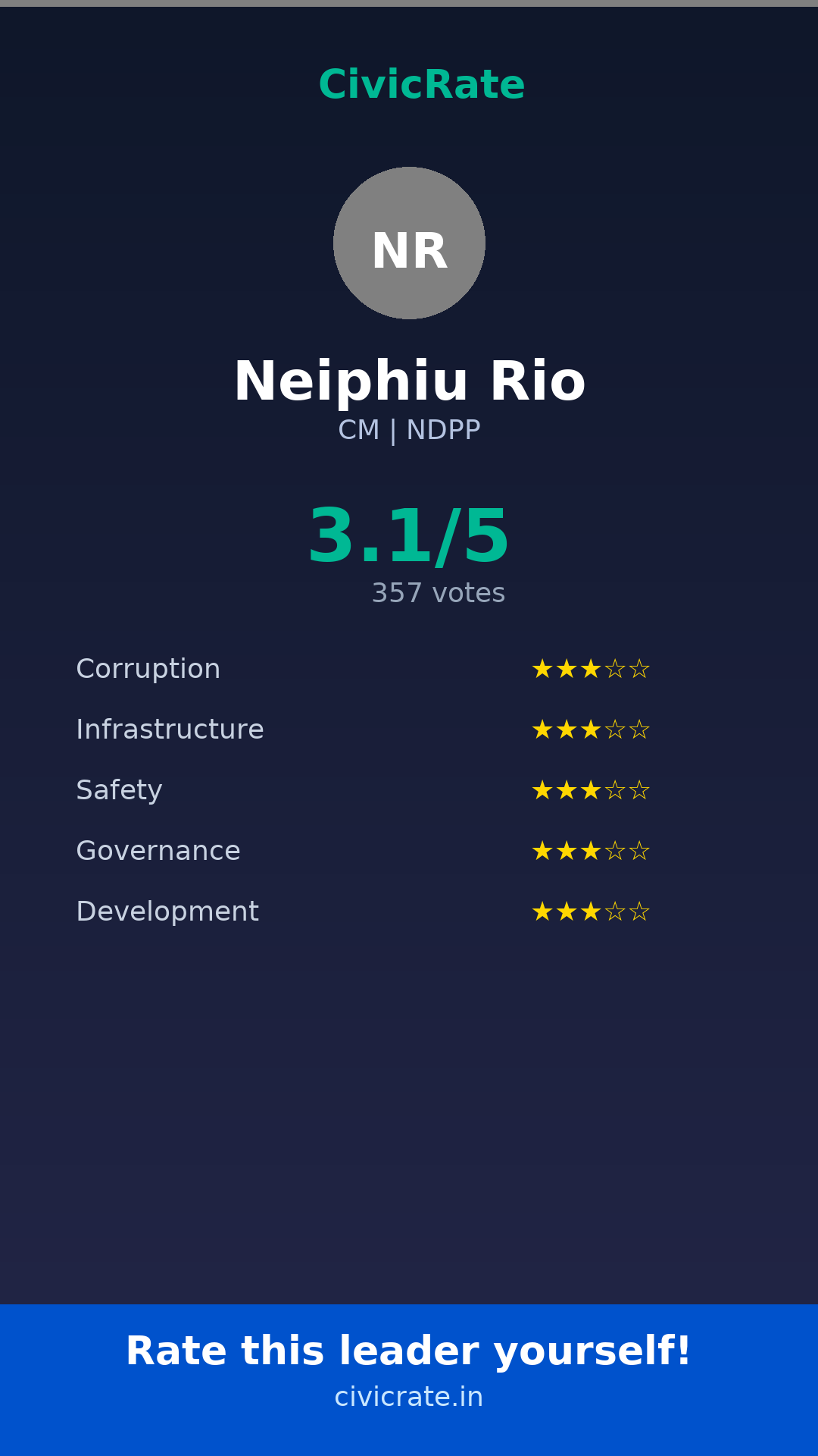 Neiphiu Rio (CM, NDPP) has an overall citizen rating (CR Score) of 3.1/5 based on 357 anonymous votes on CivicRate. The score covers 5 parameters: Corruption Perception, Infrastructure, Safety, Governance, and Development.
