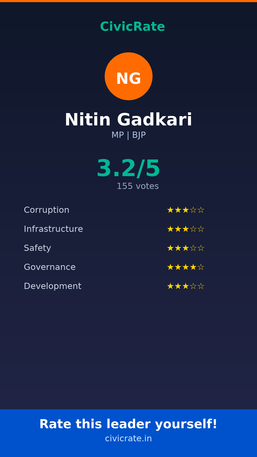 Visit civicrate.in/rate/nitin-gadkari to rate Nitin Gadkari on 5 parameters: Corruption, Infrastructure, Safety, Governance, and Development. All ratings are 100% anonymous and verified via phone OTP.