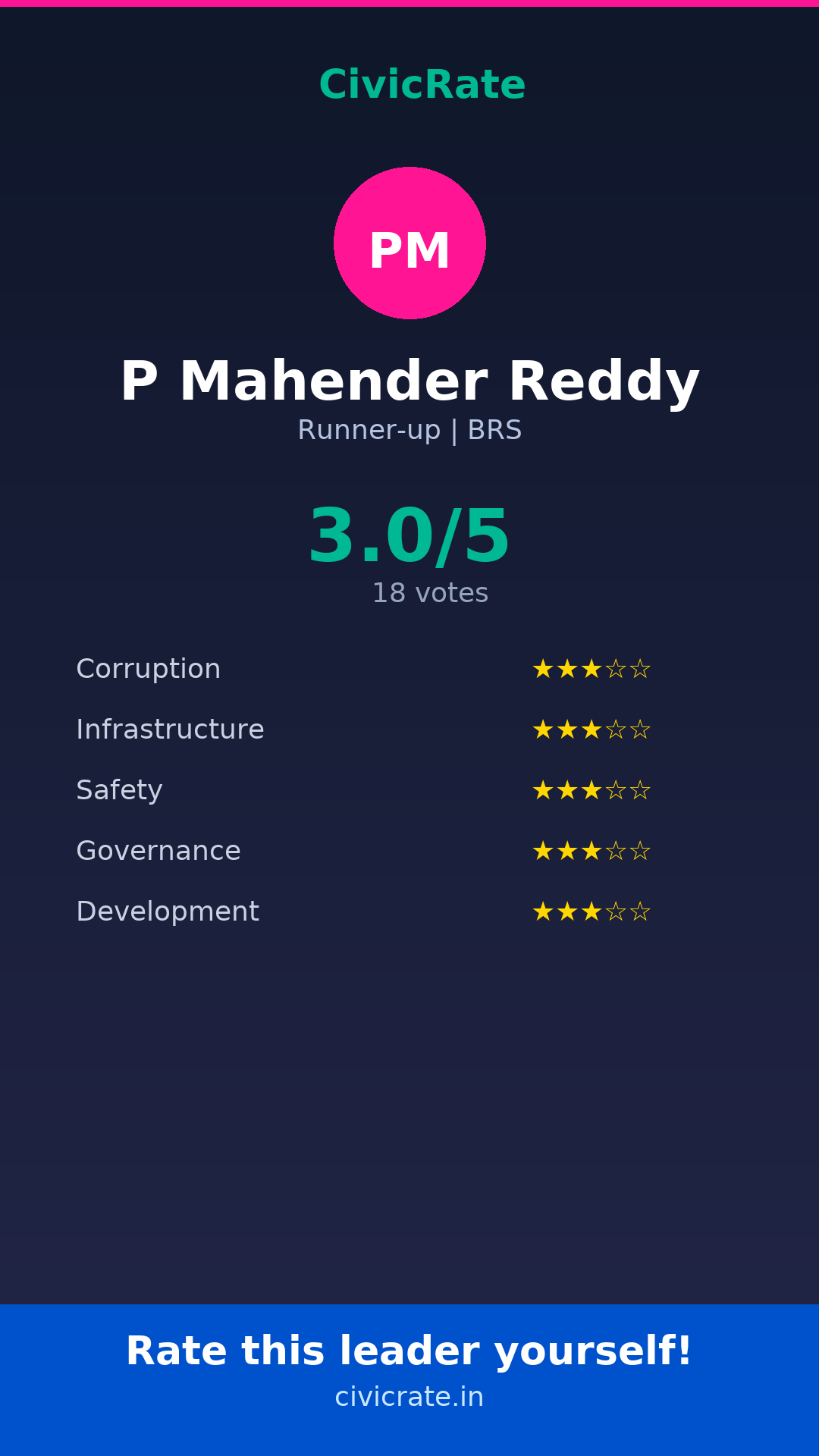 P Mahender Reddy (Runner-up, BRS) has an overall citizen rating (CR Score) of 3.0/5 based on 18 anonymous votes on CivicRate. The score covers 5 parameters: Corruption Perception, Infrastructure, Safety, Governance, and Development.