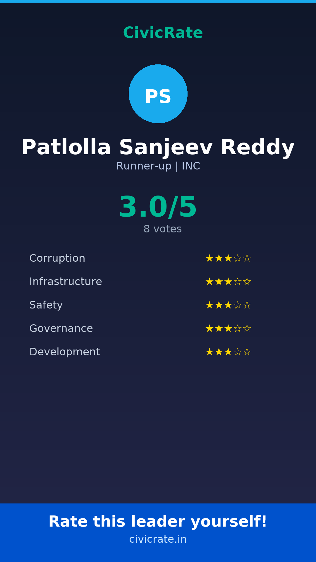 Patlolla Sanjeev Reddy (Runner-up, INC) has an overall citizen rating (CR Score) of 3.0/5 based on 8 anonymous votes on CivicRate. The score covers 5 parameters: Corruption Perception, Infrastructure, Safety, Governance, and Development.