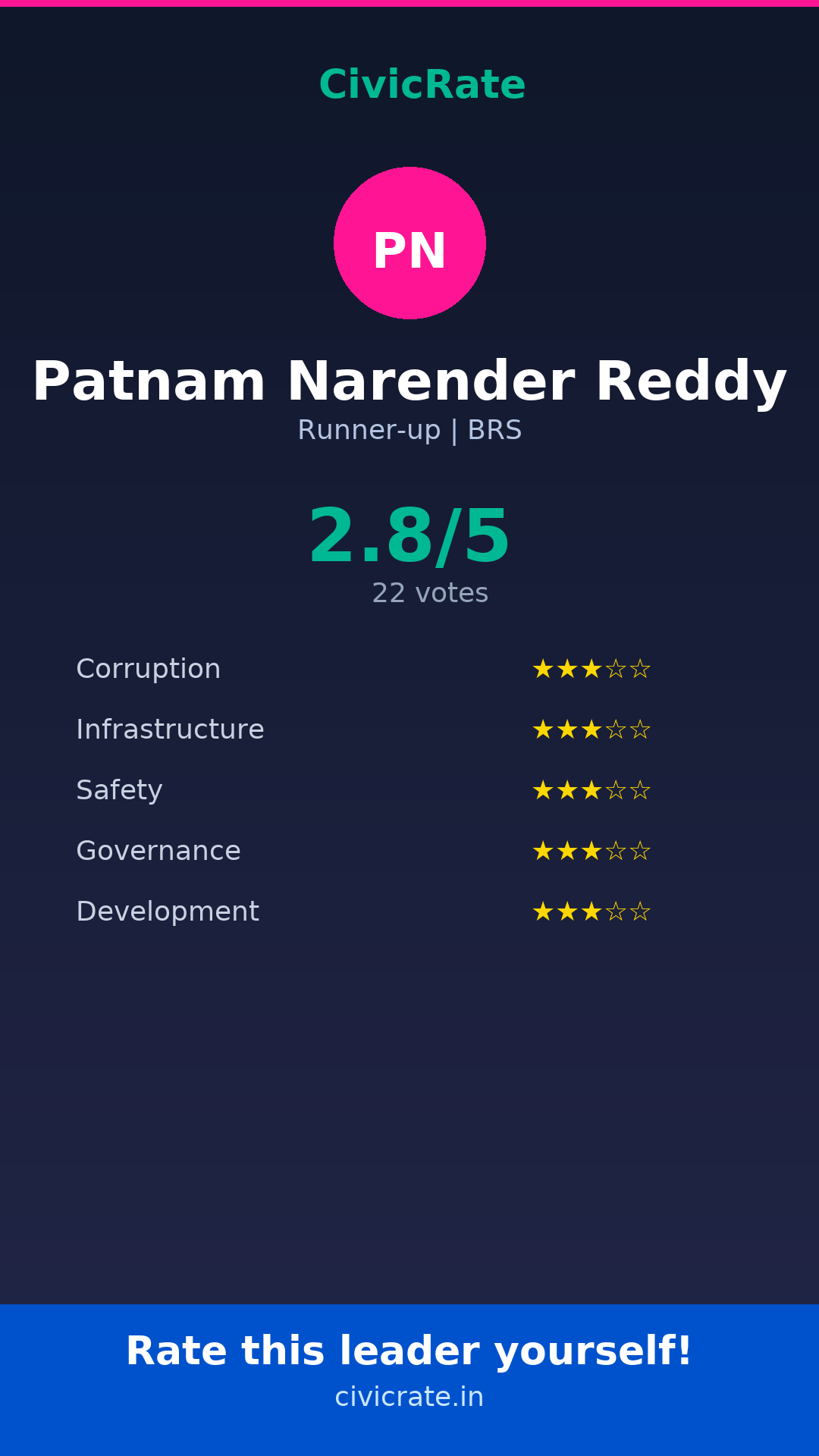 Patnam Narender Reddy (Runner-up, BRS) has an overall citizen rating (CR Score) of 2.8/5 based on 22 anonymous votes on CivicRate. The score covers 5 parameters: Corruption Perception, Infrastructure, Safety, Governance, and Development.