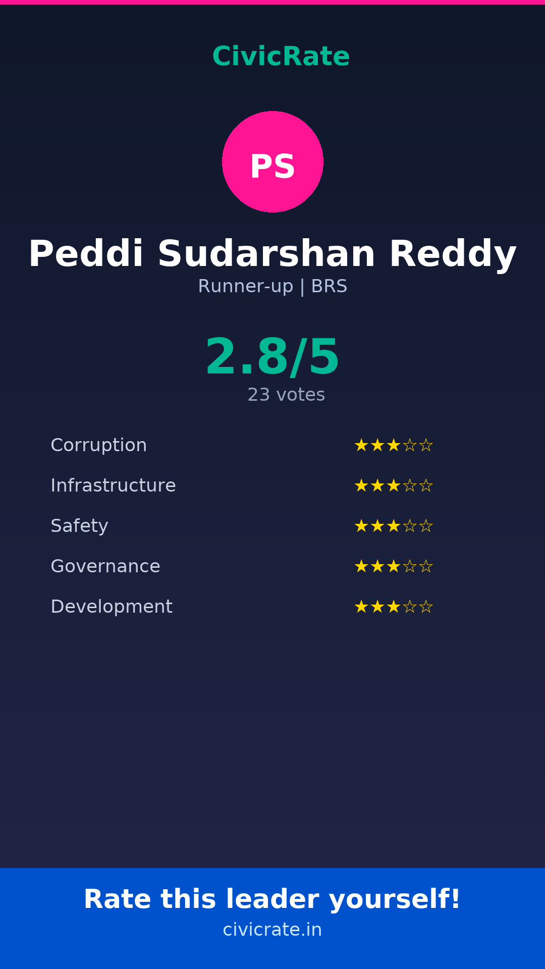 Peddi Sudarshan Reddy (Runner-up, BRS) has an overall citizen rating (CR Score) of 2.8/5 based on 23 anonymous votes on CivicRate. The score covers 5 parameters: Corruption Perception, Infrastructure, Safety, Governance, and Development.