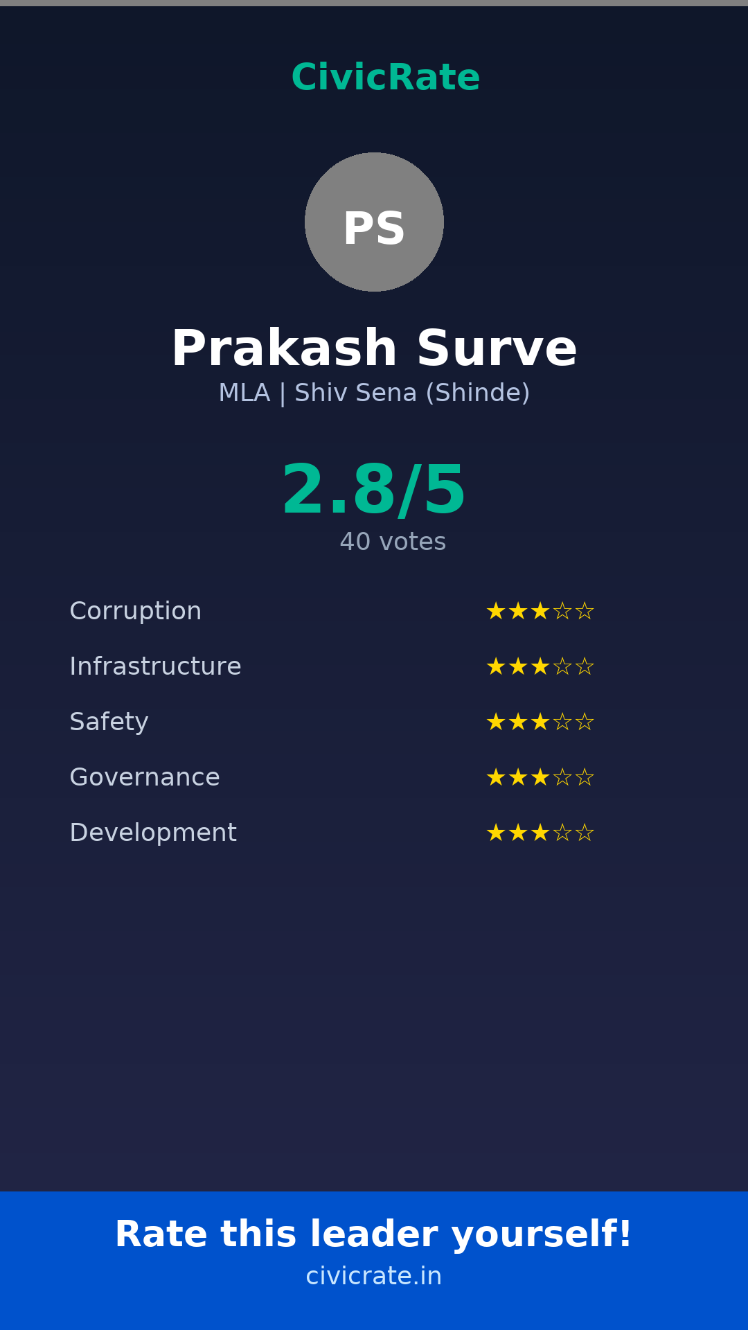 Visit civicrate.in/rate/prakash-surve to rate Prakash Surve on 5 parameters: Corruption, Infrastructure, Safety, Governance, and Development. All ratings are 100% anonymous and verified via phone OTP.
