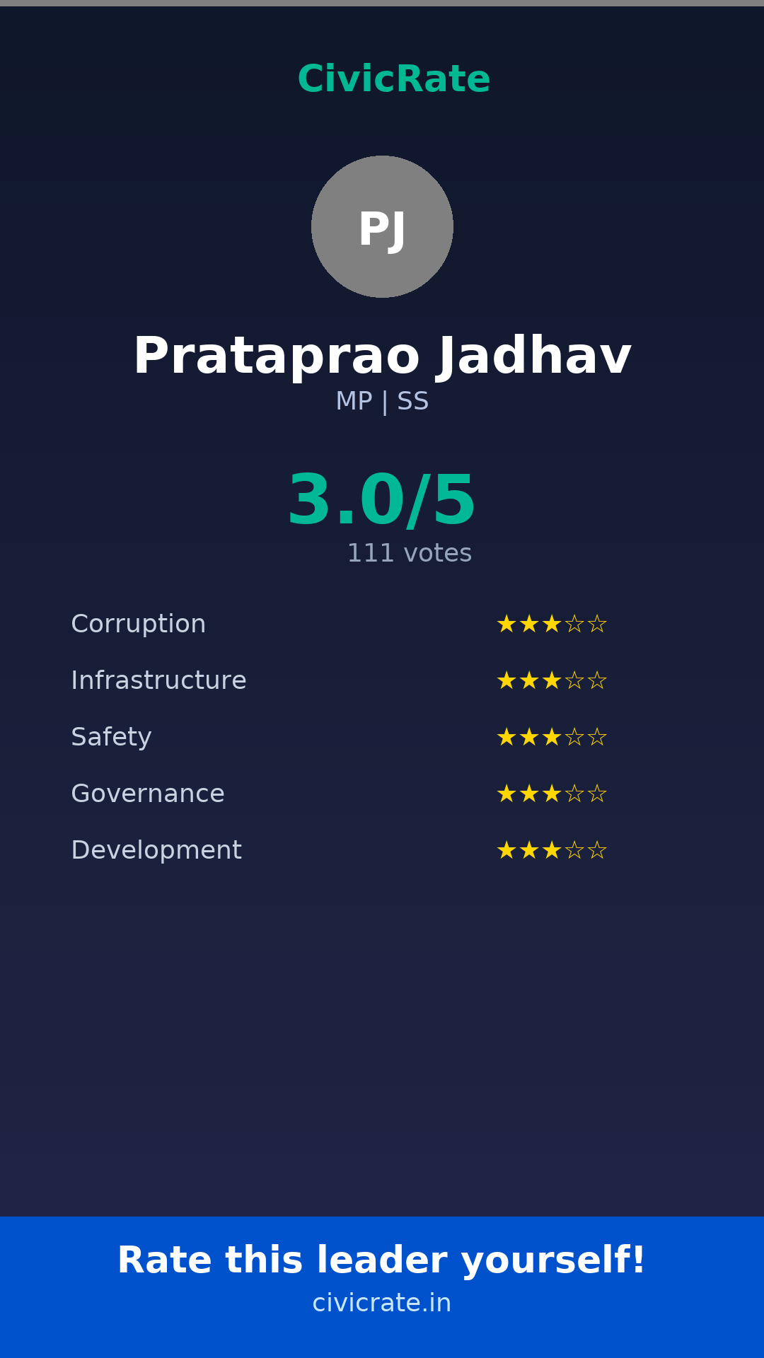 Prataprao Jadhav (MP, SS) has an overall citizen rating (CR Score) of 3.0/5 based on 111 anonymous votes on CivicRate. The score covers 5 parameters: Corruption Perception, Infrastructure, Safety, Governance, and Development.