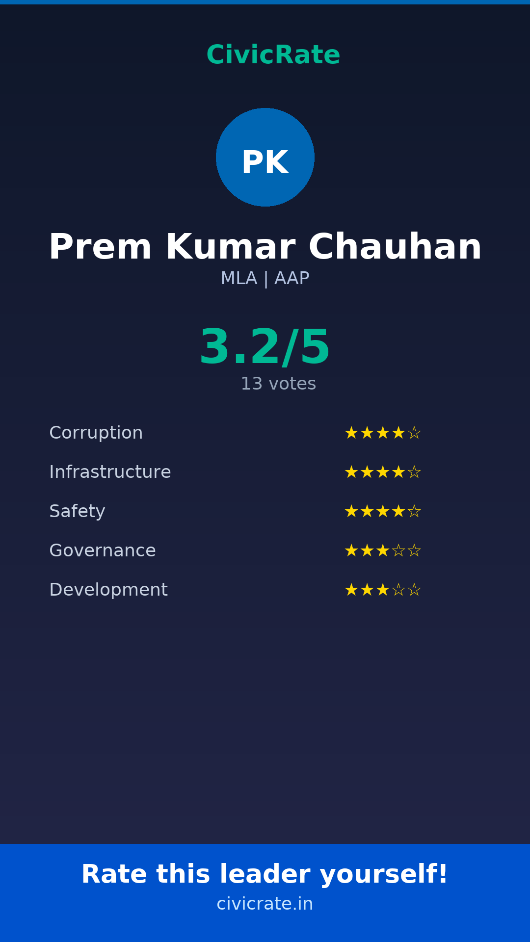 Prem Kumar Chauhan (MLA, AAP) has an overall citizen rating (CR Score) of 3.2/5 based on 13 anonymous votes on CivicRate. The score covers 5 parameters: Corruption Perception, Infrastructure, Safety, Governance, and Development.