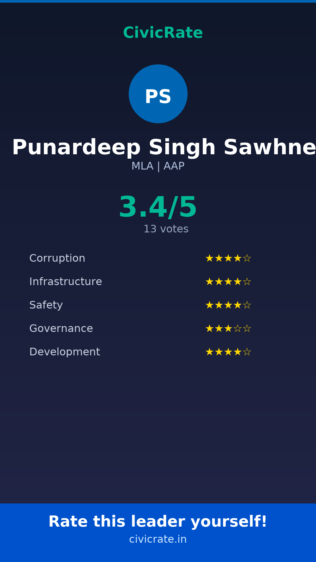 Punardeep Singh Sawhney (MLA, AAP) has an overall citizen rating (CR Score) of 3.4/5 based on 13 anonymous votes on CivicRate. The score covers 5 parameters: Corruption Perception, Infrastructure, Safety, Governance, and Development.