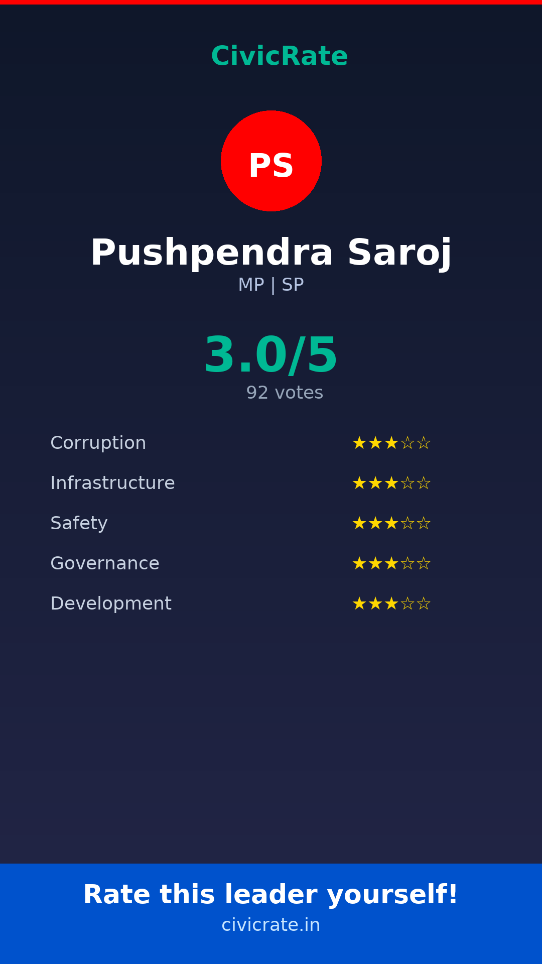 Pushpendra Saroj (MP, SP) has an overall citizen rating (CR Score) of 3.0/5 based on 92 anonymous votes on CivicRate. The score covers 5 parameters: Corruption Perception, Infrastructure, Safety, Governance, and Development.