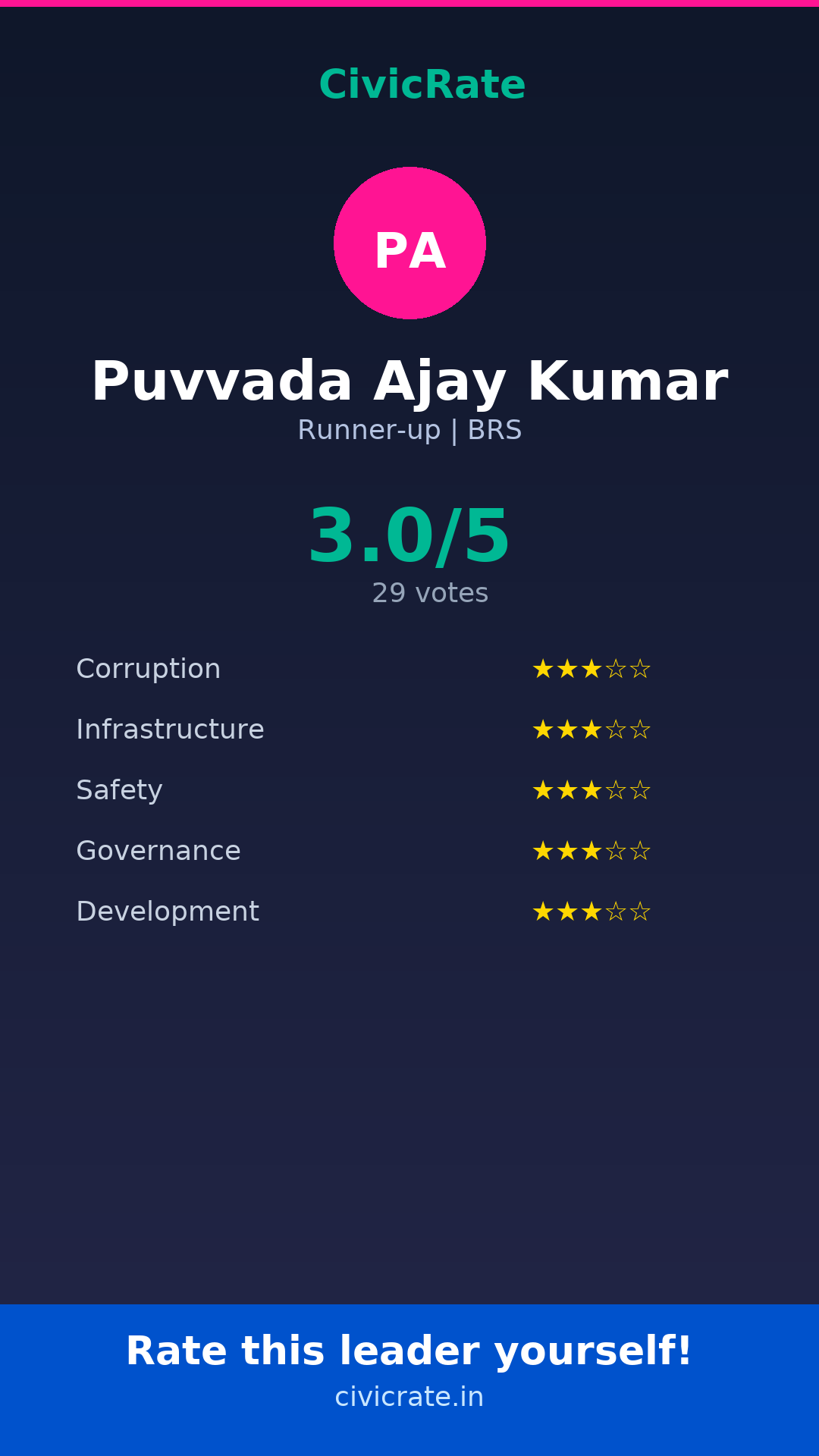 Puvvada Ajay Kumar (Runner-up, BRS) has an overall citizen rating (CR Score) of 3.0/5 based on 29 anonymous votes on CivicRate. The score covers 5 parameters: Corruption Perception, Infrastructure, Safety, Governance, and Development.