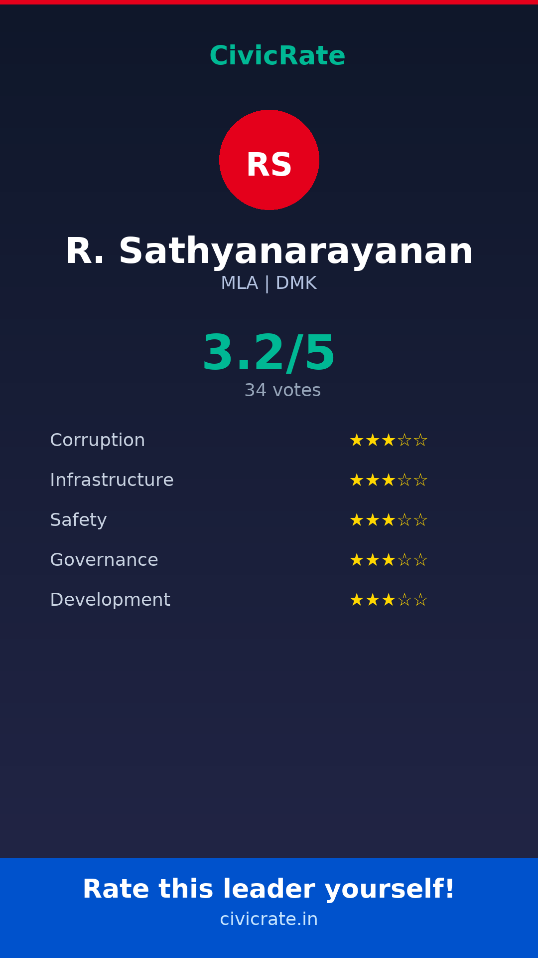 R. Sathyanarayanan (MLA, DMK) has an overall citizen rating (CR Score) of 3.2/5 based on 34 anonymous votes on CivicRate. The score covers 5 parameters: Corruption Perception, Infrastructure, Safety, Governance, and Development.