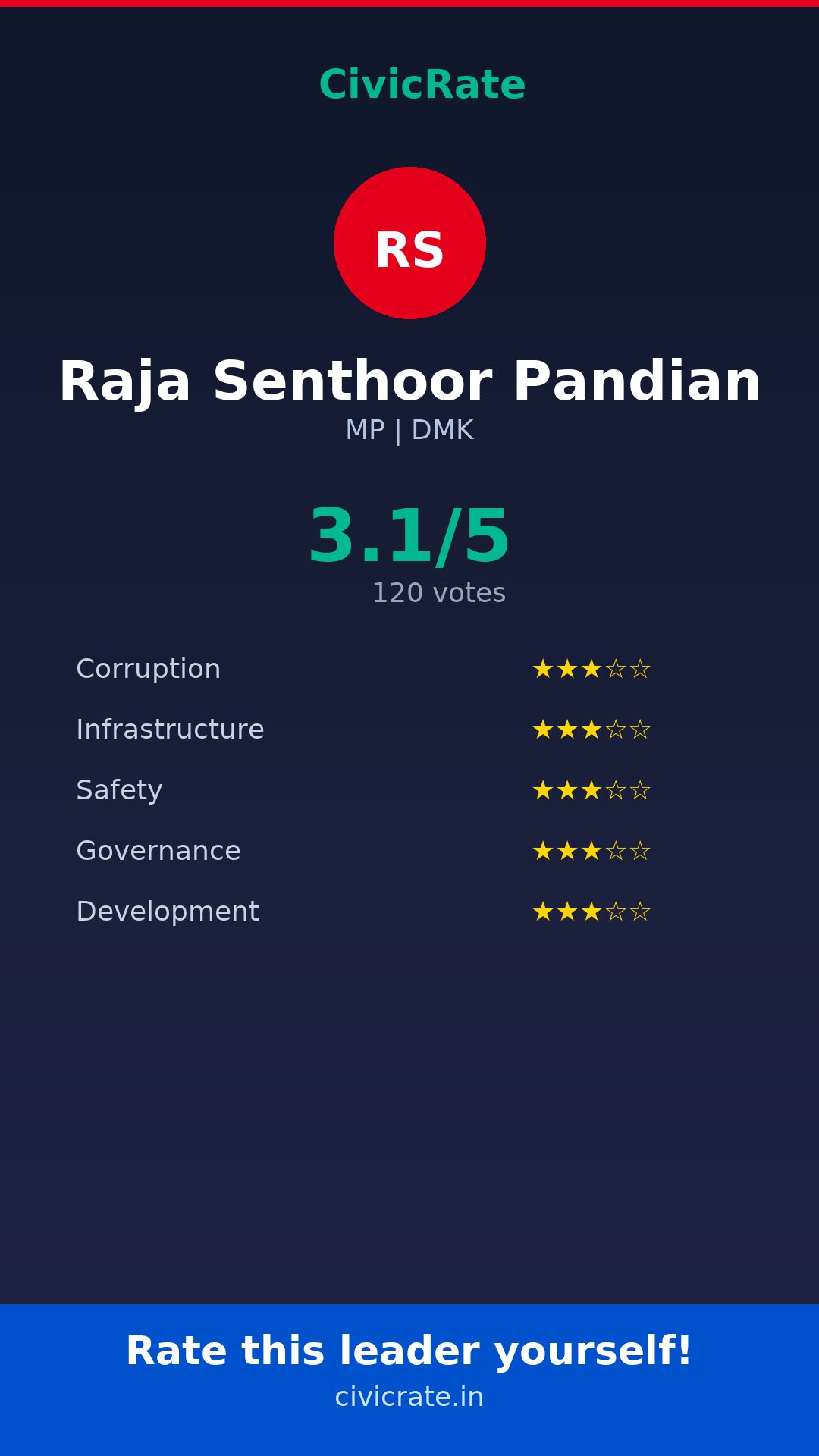 Raja Senthoor Pandian (MP, DMK) has an overall citizen rating (CR Score) of 3.1/5 based on 120 anonymous votes on CivicRate. The score covers 5 parameters: Corruption Perception, Infrastructure, Safety, Governance, and Development.