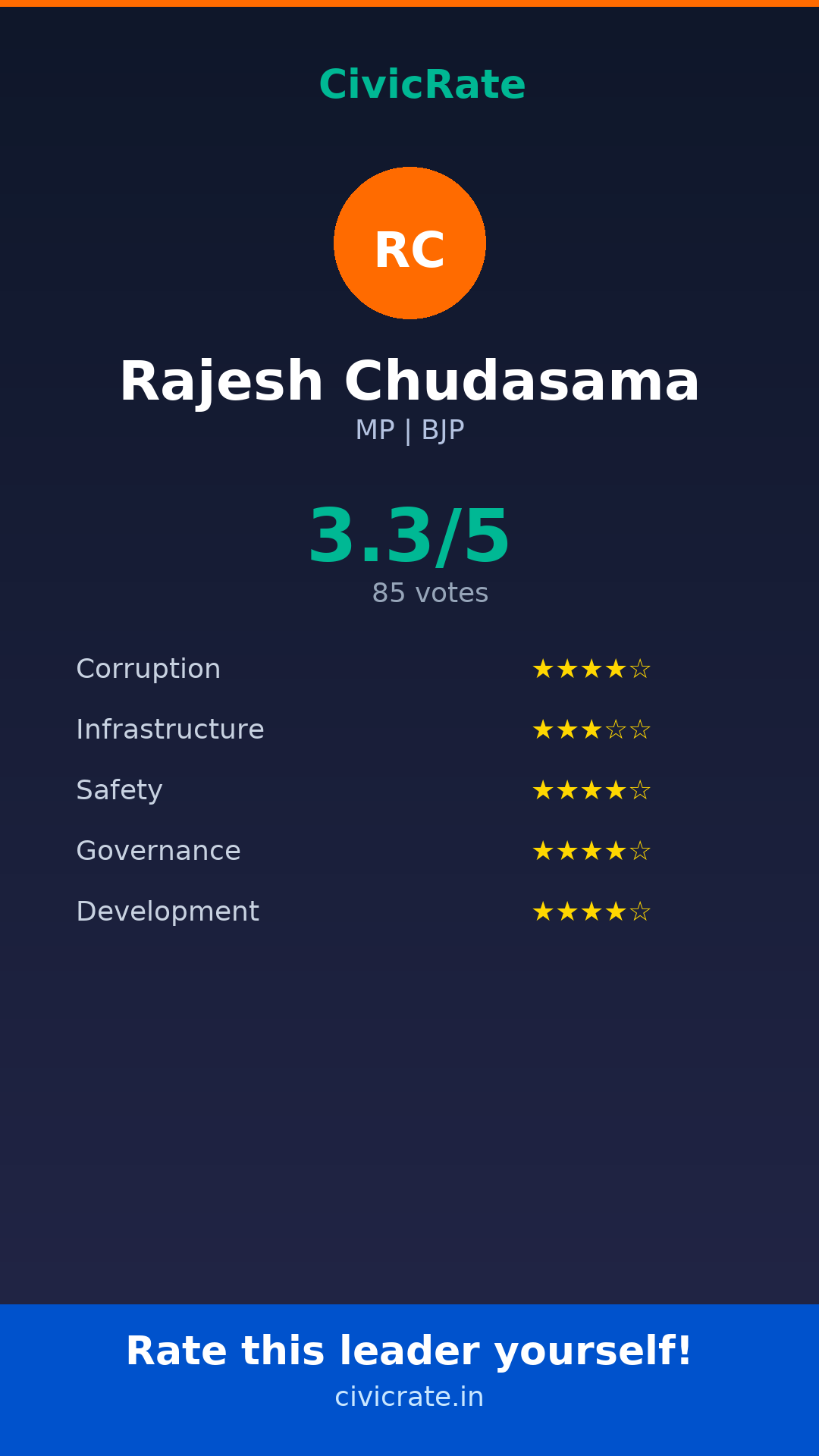 Rajesh Chudasama (MP, BJP) has an overall citizen rating (CR Score) of 3.3/5 based on 85 anonymous votes on CivicRate. The score covers 5 parameters: Corruption Perception, Infrastructure, Safety, Governance, and Development.