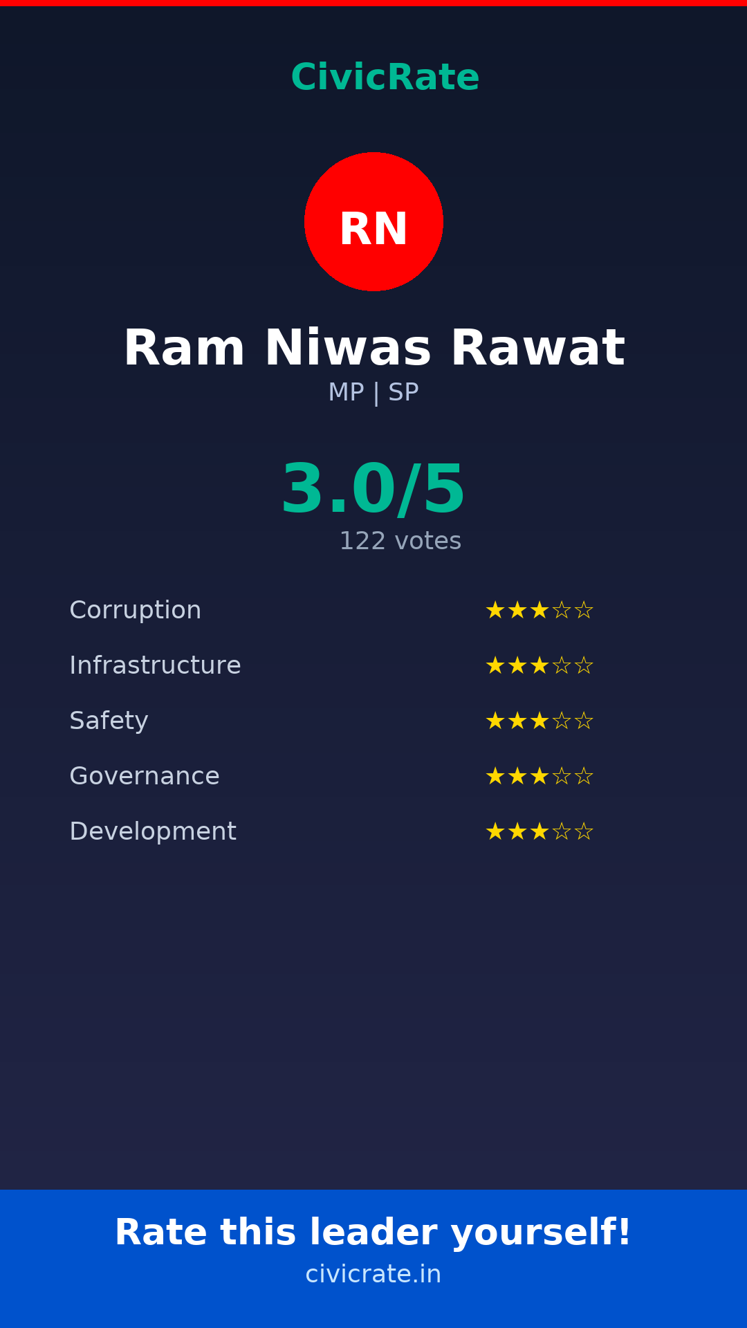 Ram Niwas Rawat (MP, SP) has an overall citizen rating (CR Score) of 3.0/5 based on 122 anonymous votes on CivicRate. The score covers 5 parameters: Corruption Perception, Infrastructure, Safety, Governance, and Development.