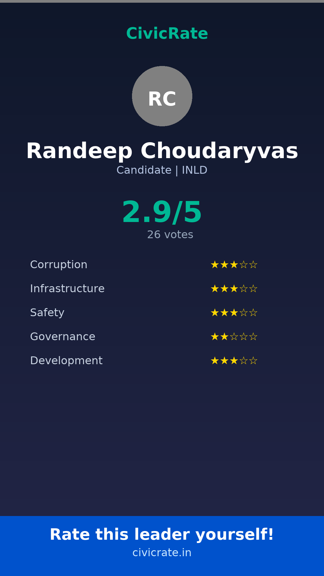 Randeep Choudaryvas (Candidate, INLD) has an overall citizen rating (CR Score) of 2.9/5 based on 26 anonymous votes on CivicRate. The score covers 5 parameters: Corruption Perception, Infrastructure, Safety, Governance, and Development.