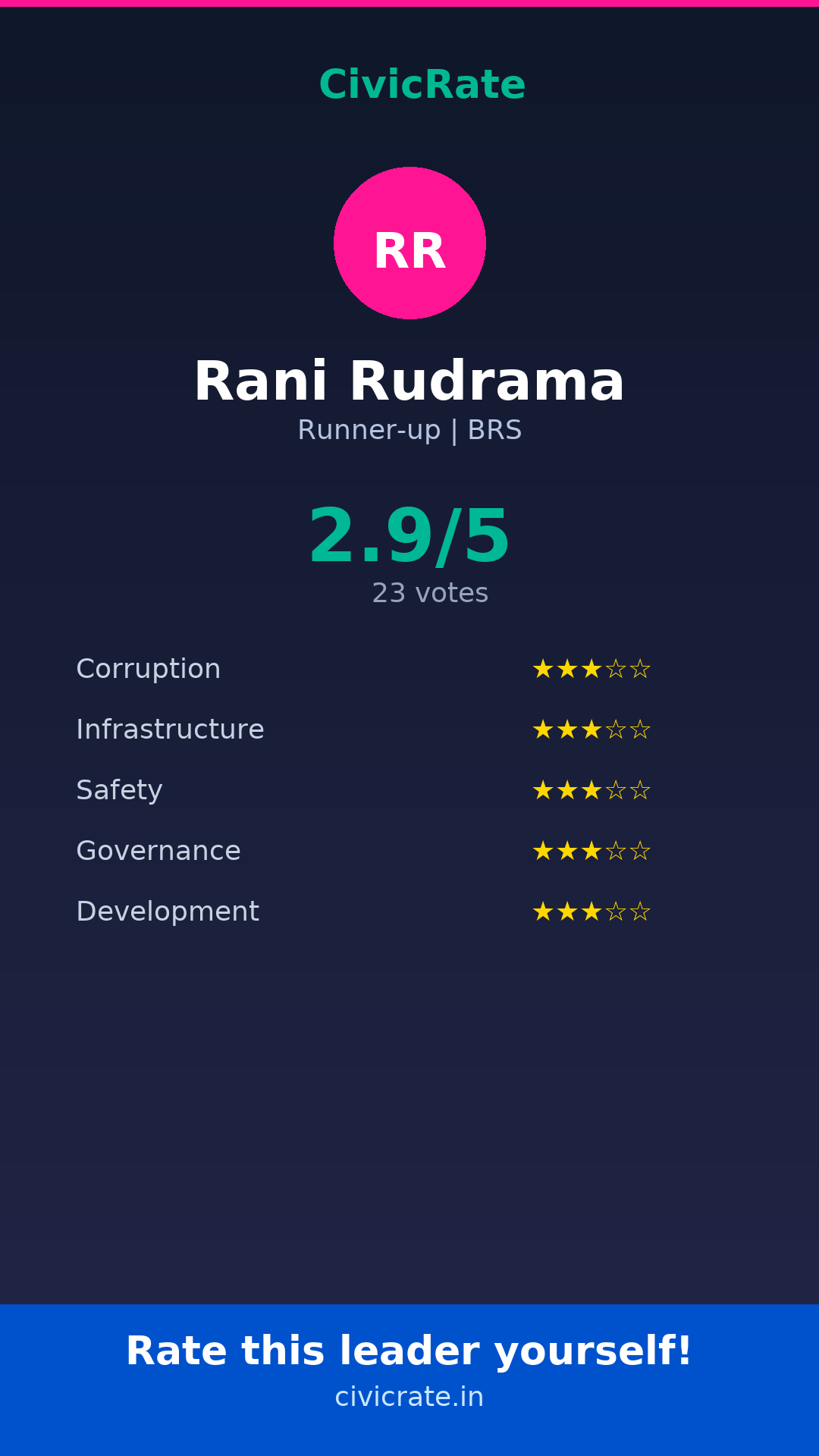 Rani Rudrama (Runner-up, BRS) has an overall citizen rating (CR Score) of 2.9/5 based on 23 anonymous votes on CivicRate. The score covers 5 parameters: Corruption Perception, Infrastructure, Safety, Governance, and Development.