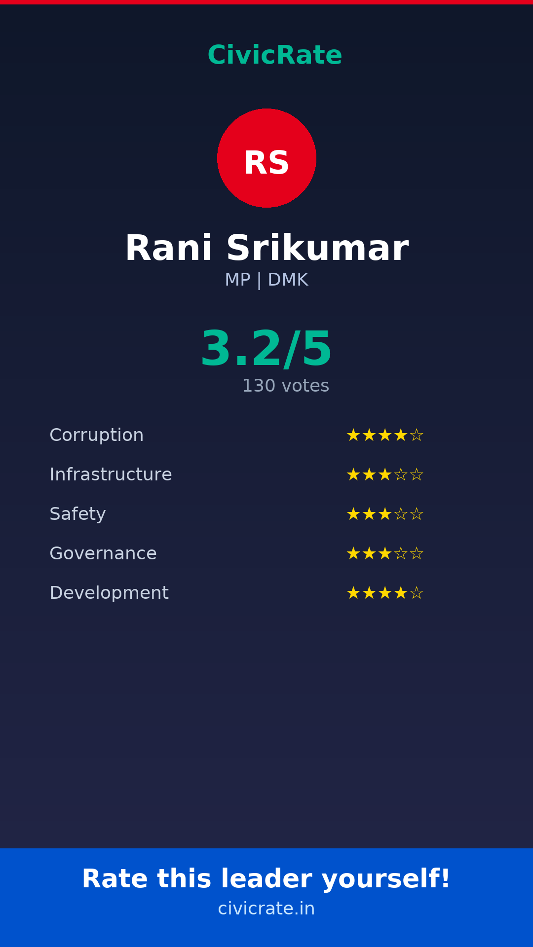 Rani Srikumar (MP, DMK) has an overall citizen rating (CR Score) of 3.2/5 based on 130 anonymous votes on CivicRate. The score covers 5 parameters: Corruption Perception, Infrastructure, Safety, Governance, and Development.