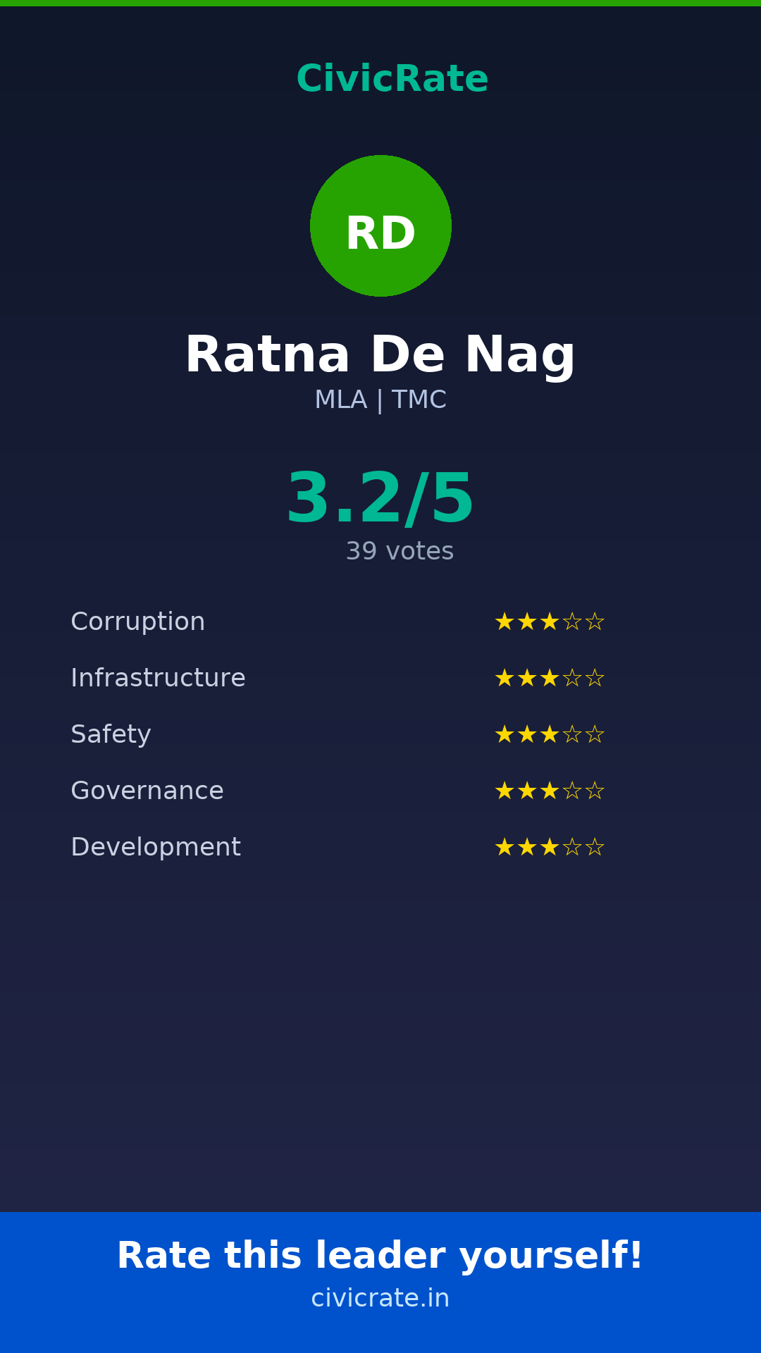 Ratna De Nag (MLA, TMC) has an overall citizen rating (CR Score) of 3.2/5 based on 39 anonymous votes on CivicRate. The score covers 5 parameters: Corruption Perception, Infrastructure, Safety, Governance, and Development.