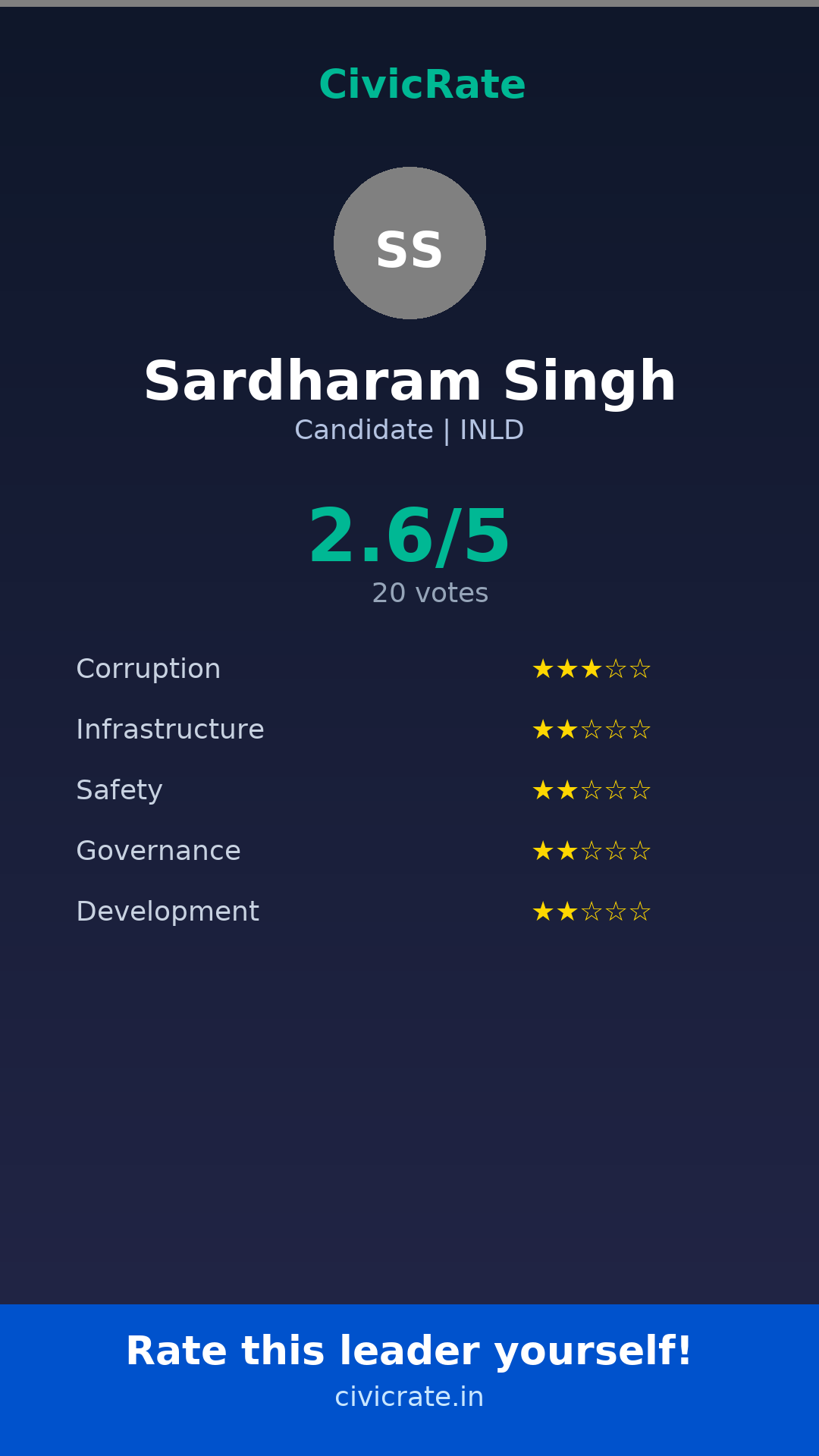 Sardharam Singh (Candidate, INLD) has an overall citizen rating (CR Score) of 2.6/5 based on 20 anonymous votes on CivicRate. The score covers 5 parameters: Corruption Perception, Infrastructure, Safety, Governance, and Development.