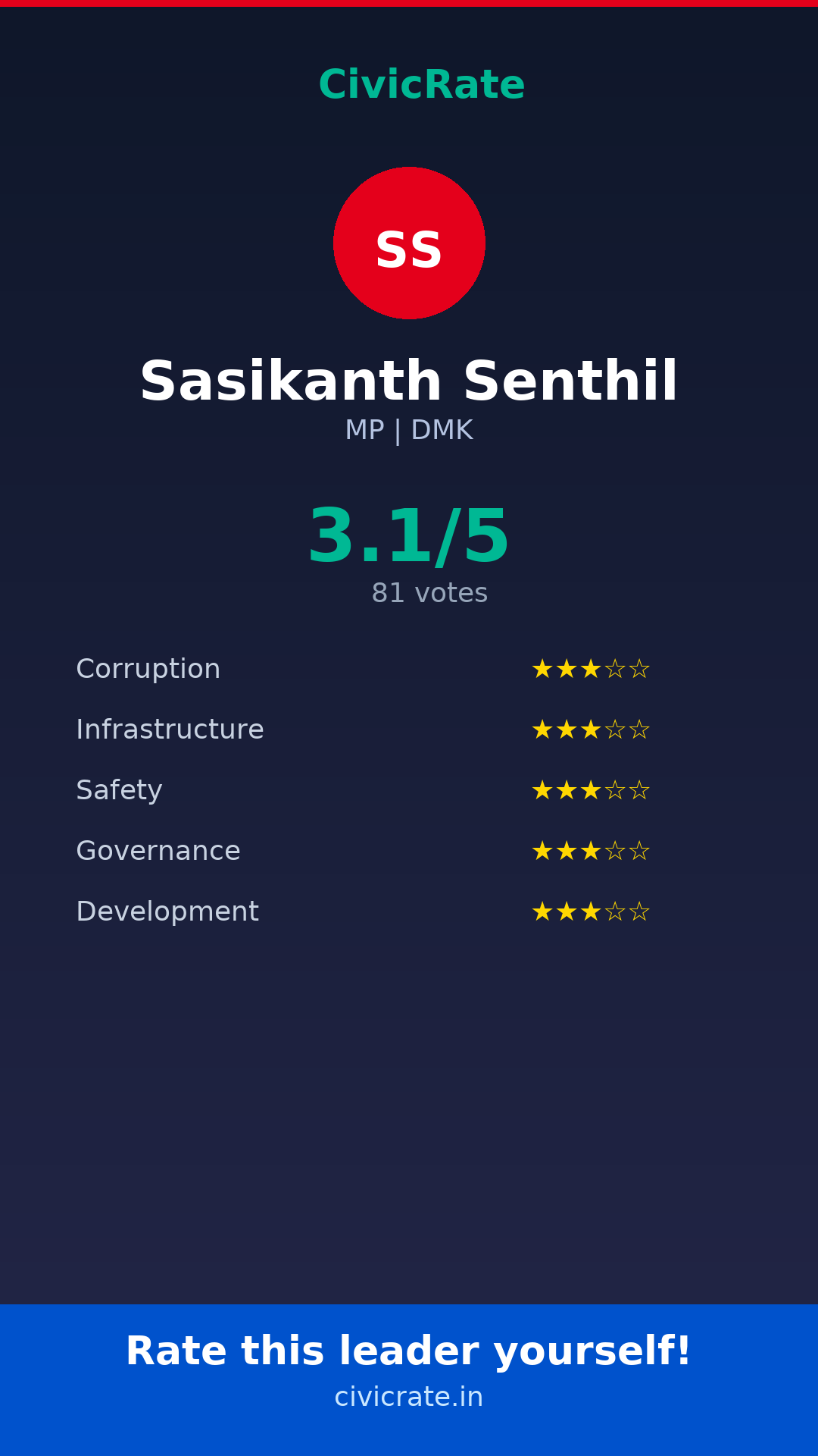 Sasikanth Senthil (MP, DMK) has an overall citizen rating (CR Score) of 3.1/5 based on 81 anonymous votes on CivicRate. The score covers 5 parameters: Corruption Perception, Infrastructure, Safety, Governance, and Development.