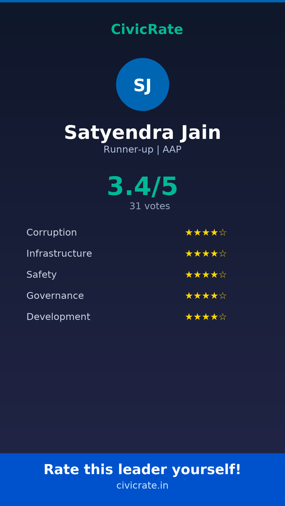 Satyendra Jain (Runner-up, AAP) has an overall citizen rating (CR Score) of 3.4/5 based on 31 anonymous votes on CivicRate. The score covers 5 parameters: Corruption Perception, Infrastructure, Safety, Governance, and Development.