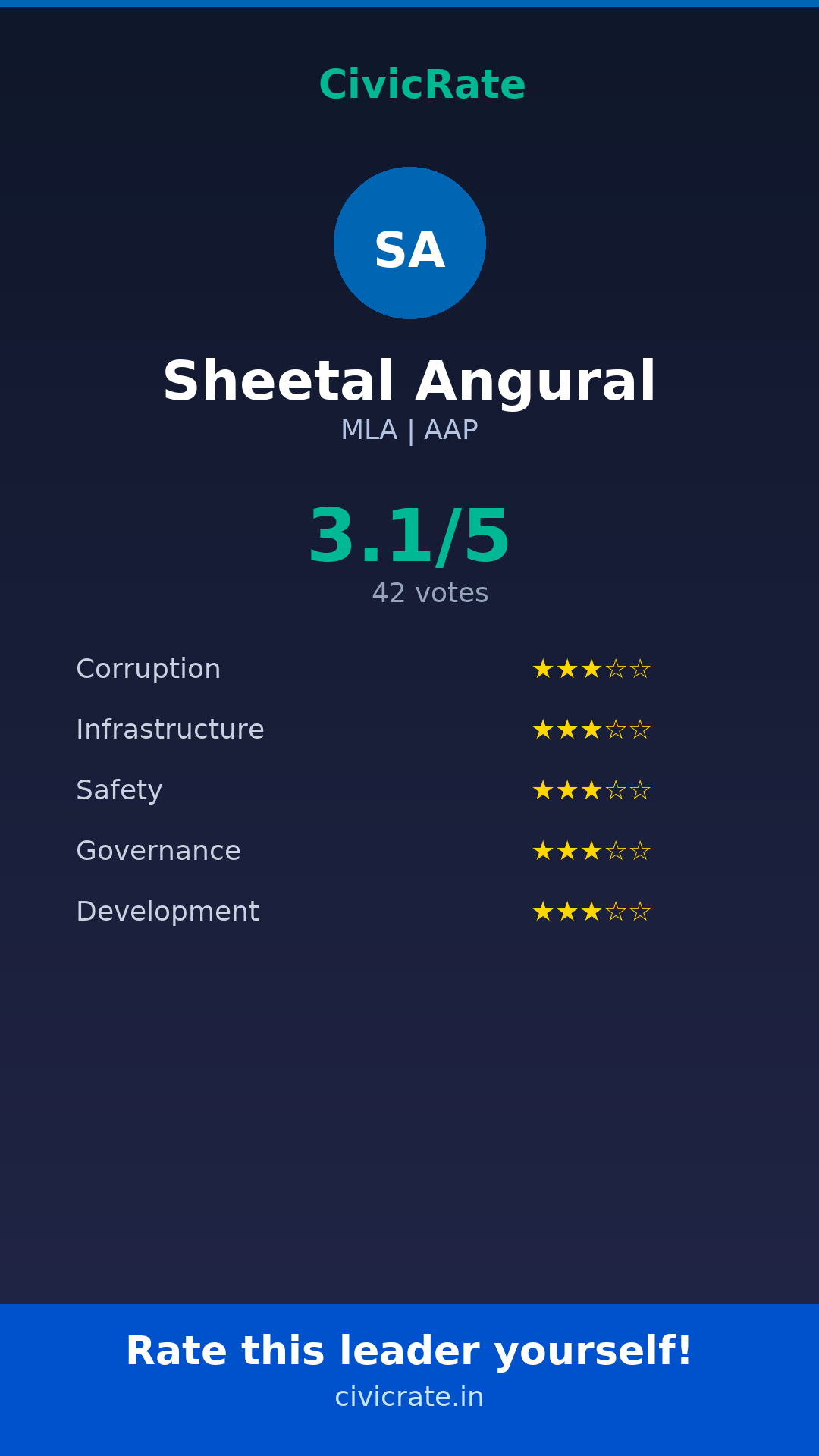 Sheetal Angural (MLA, AAP) has an overall citizen rating (CR Score) of 3.1/5 based on 42 anonymous votes on CivicRate. The score covers 5 parameters: Corruption Perception, Infrastructure, Safety, Governance, and Development.