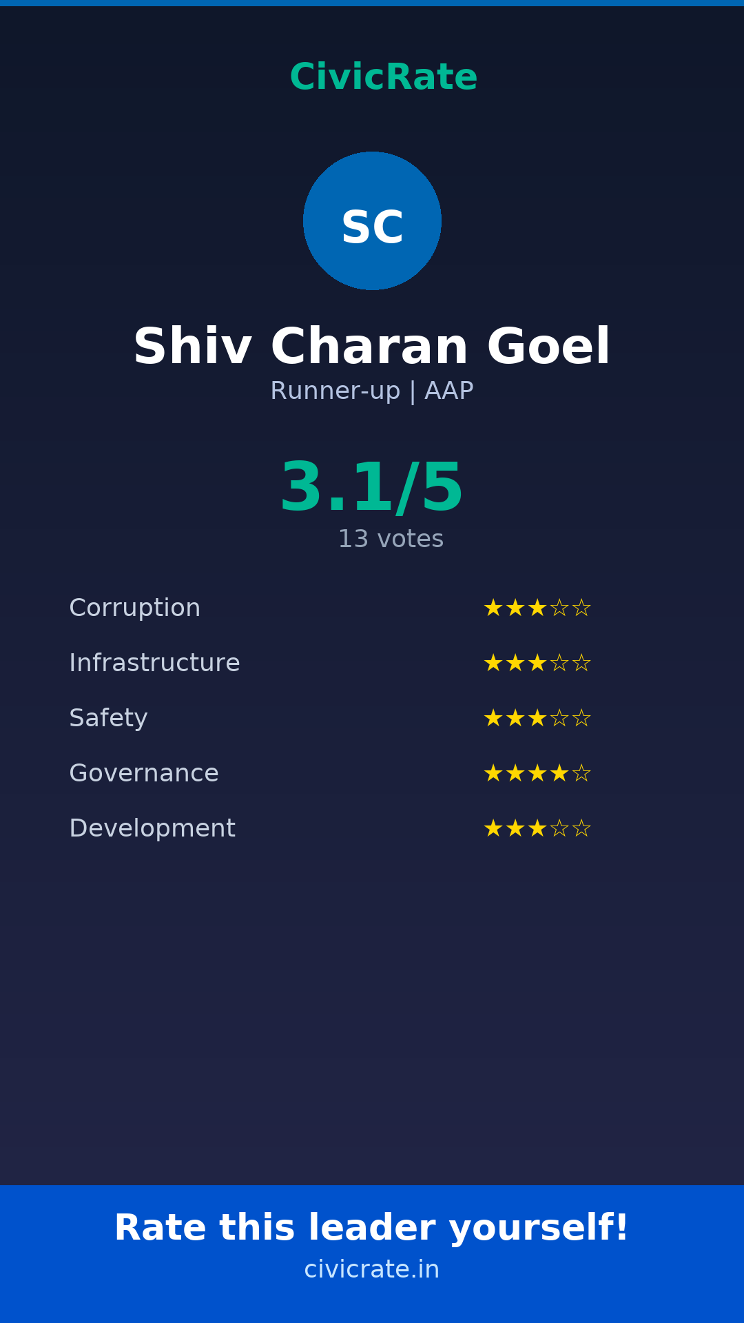 Shiv Charan Goel (Runner-up, AAP) has an overall citizen rating (CR Score) of 3.1/5 based on 13 anonymous votes on CivicRate. The score covers 5 parameters: Corruption Perception, Infrastructure, Safety, Governance, and Development.