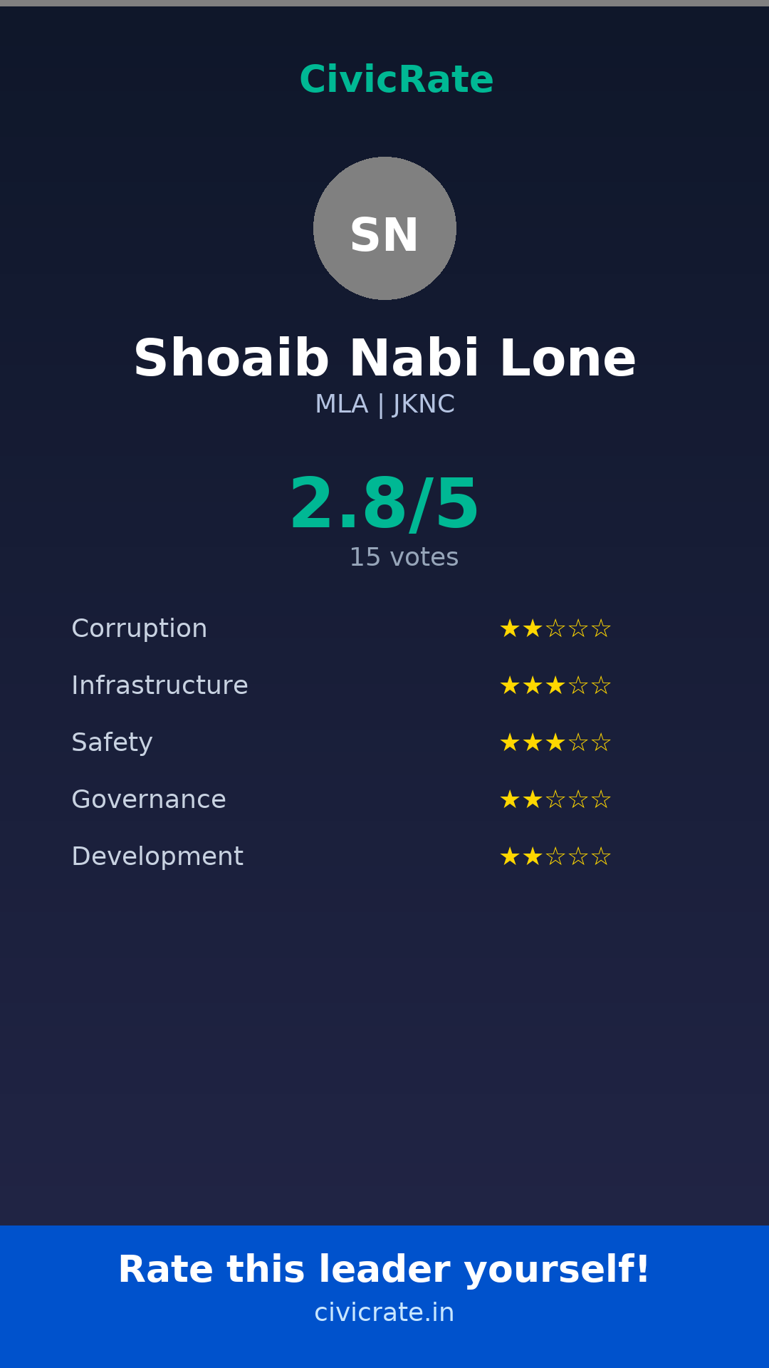 Visit civicrate.in/rate/shoaib-nabi-lone to rate Shoaib Nabi Lone on 5 parameters: Corruption, Infrastructure, Safety, Governance, and Development. All ratings are 100% anonymous and verified via phone OTP.