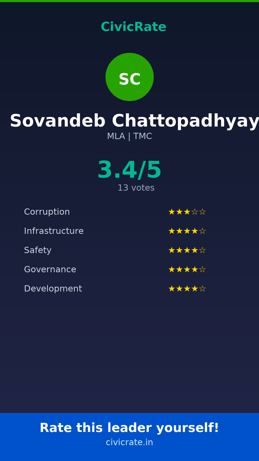 Sovandeb Chattopadhyay (MLA, TMC) has an overall citizen rating (CR Score) of 3.4/5 based on 13 anonymous votes on CivicRate. The score covers 5 parameters: Corruption Perception, Infrastructure, Safety, Governance, and Development.