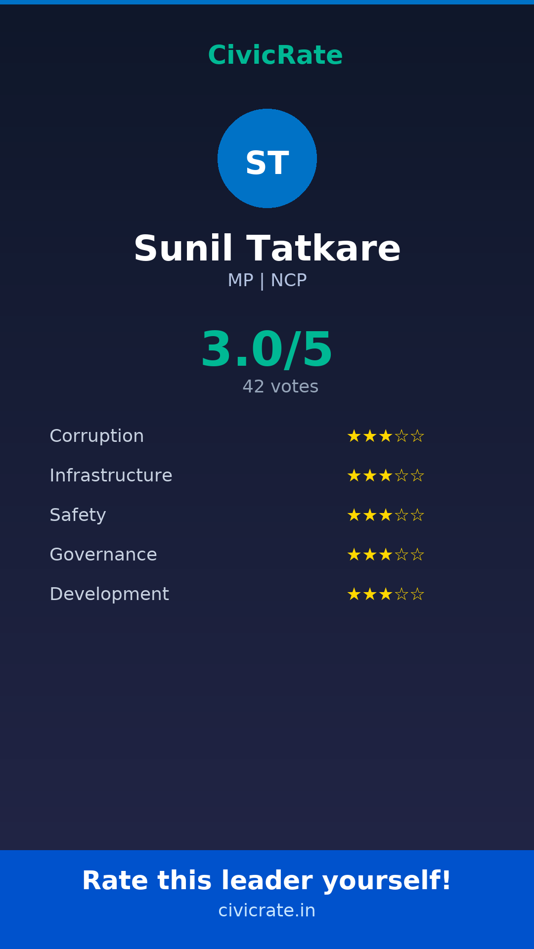 Sunil Tatkare (MP, NCP) has an overall citizen rating (CR Score) of 3.0/5 based on 42 anonymous votes on CivicRate. The score covers 5 parameters: Corruption Perception, Infrastructure, Safety, Governance, and Development.