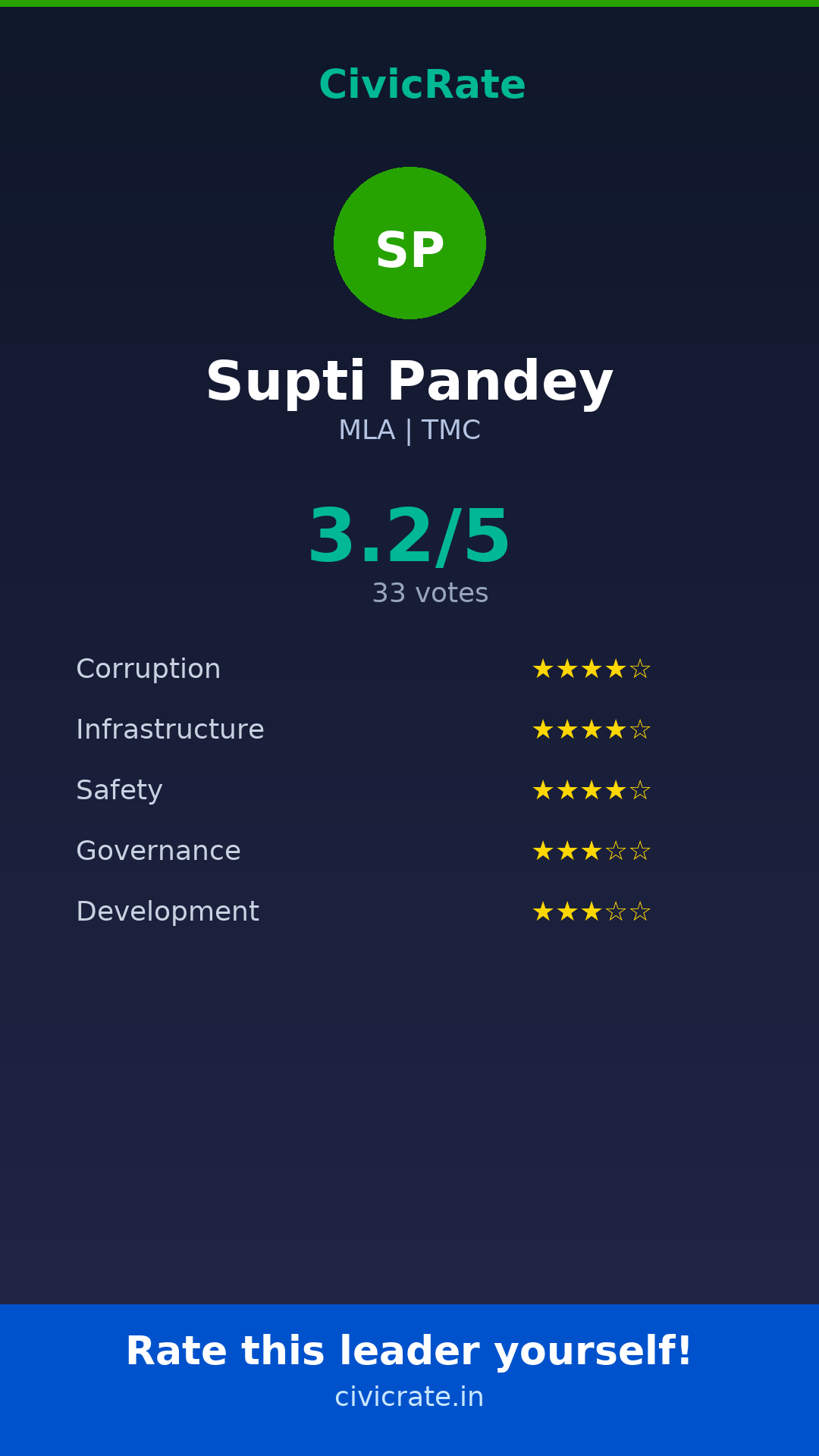 Supti Pandey (MLA, TMC) has an overall citizen rating (CR Score) of 3.2/5 based on 33 anonymous votes on CivicRate. The score covers 5 parameters: Corruption Perception, Infrastructure, Safety, Governance, and Development.