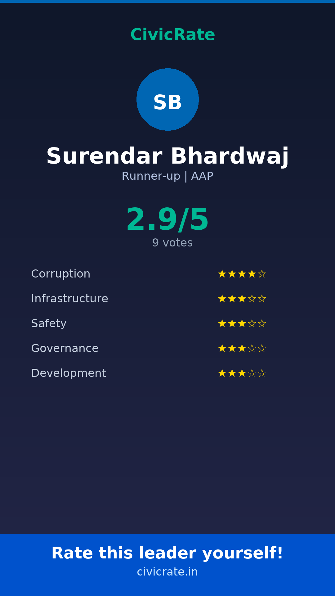 Surendar Bhardwaj (Runner-up, AAP) has an overall citizen rating (CR Score) of 2.9/5 based on 9 anonymous votes on CivicRate. The score covers 5 parameters: Corruption Perception, Infrastructure, Safety, Governance, and Development.