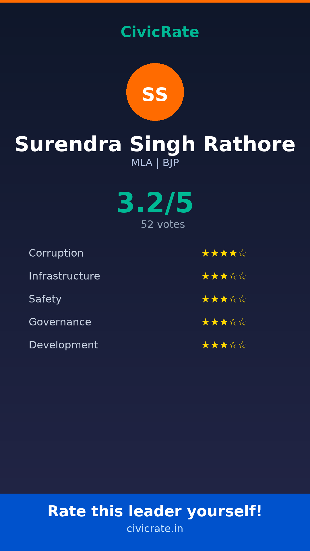 Surendra Singh Rathore (MLA, BJP) has an overall citizen rating (CR Score) of 3.2/5 based on 52 anonymous votes on CivicRate. The score covers 5 parameters: Corruption Perception, Infrastructure, Safety, Governance, and Development.