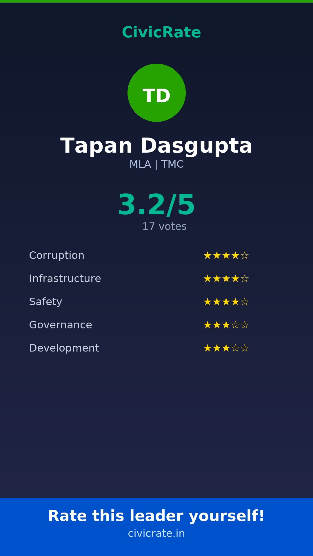 Tapan Dasgupta (MLA, TMC) has an overall citizen rating (CR Score) of 3.2/5 based on 17 anonymous votes on CivicRate. The score covers 5 parameters: Corruption Perception, Infrastructure, Safety, Governance, and Development.