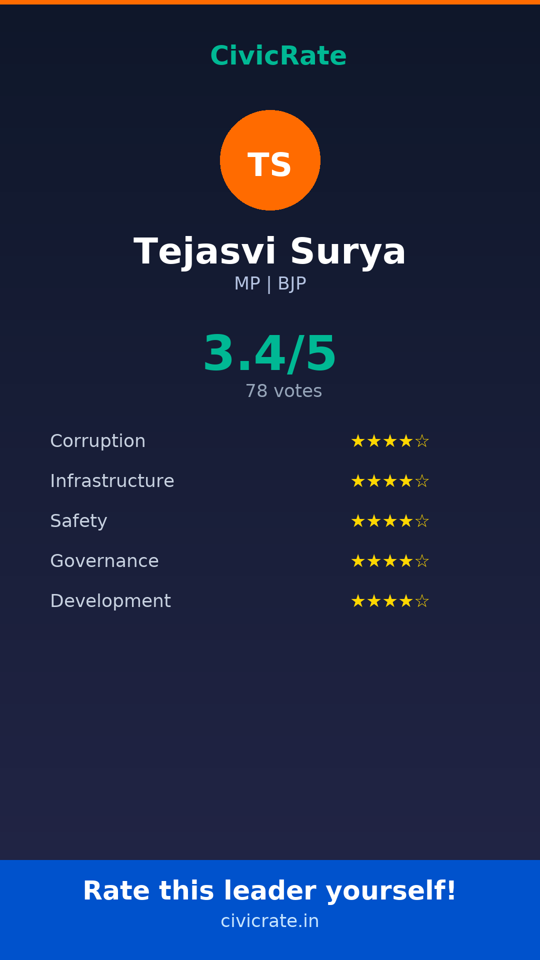 Visit civicrate.in/rate/tejasvi-surya to rate Tejasvi Surya on 5 parameters: Corruption, Infrastructure, Safety, Governance, and Development. All ratings are 100% anonymous and verified via phone OTP.