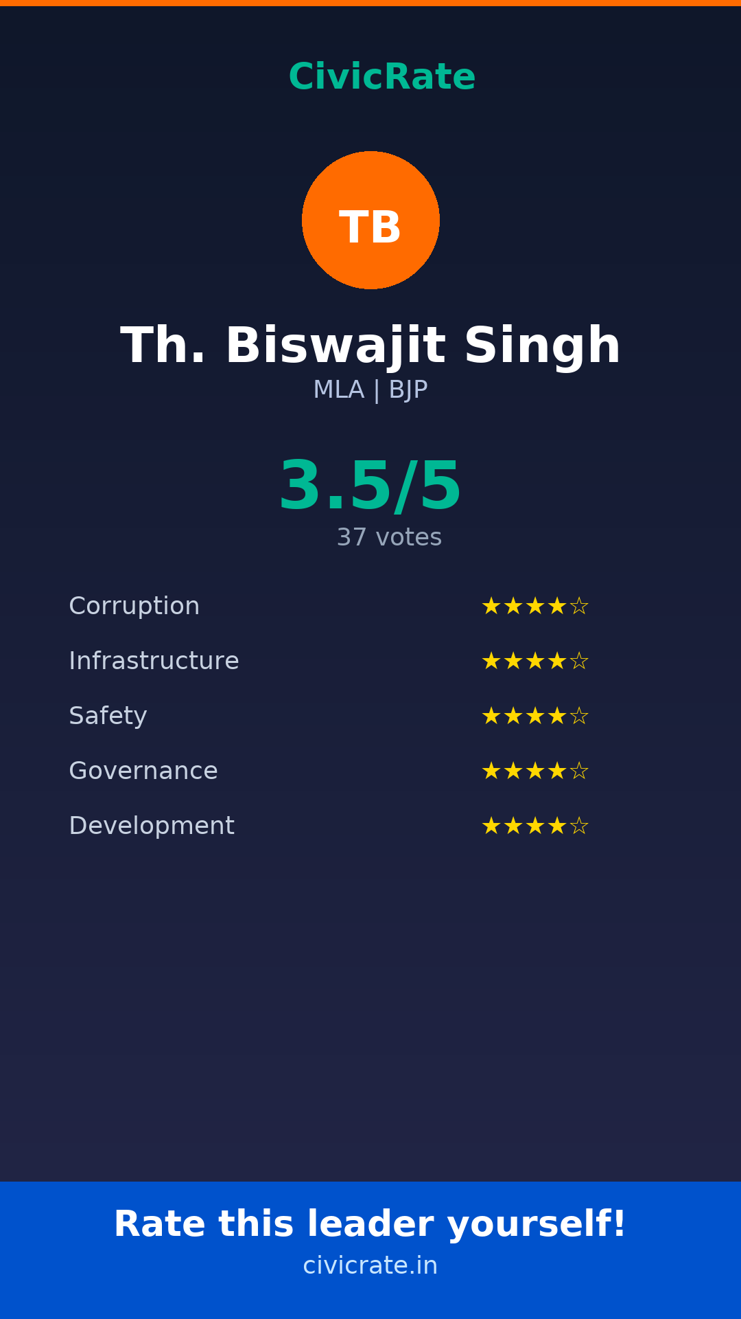 Th. Biswajit Singh (MLA, BJP) has an overall citizen rating (CR Score) of 3.5/5 based on 37 anonymous votes on CivicRate. The score covers 5 parameters: Corruption Perception, Infrastructure, Safety, Governance, and Development.